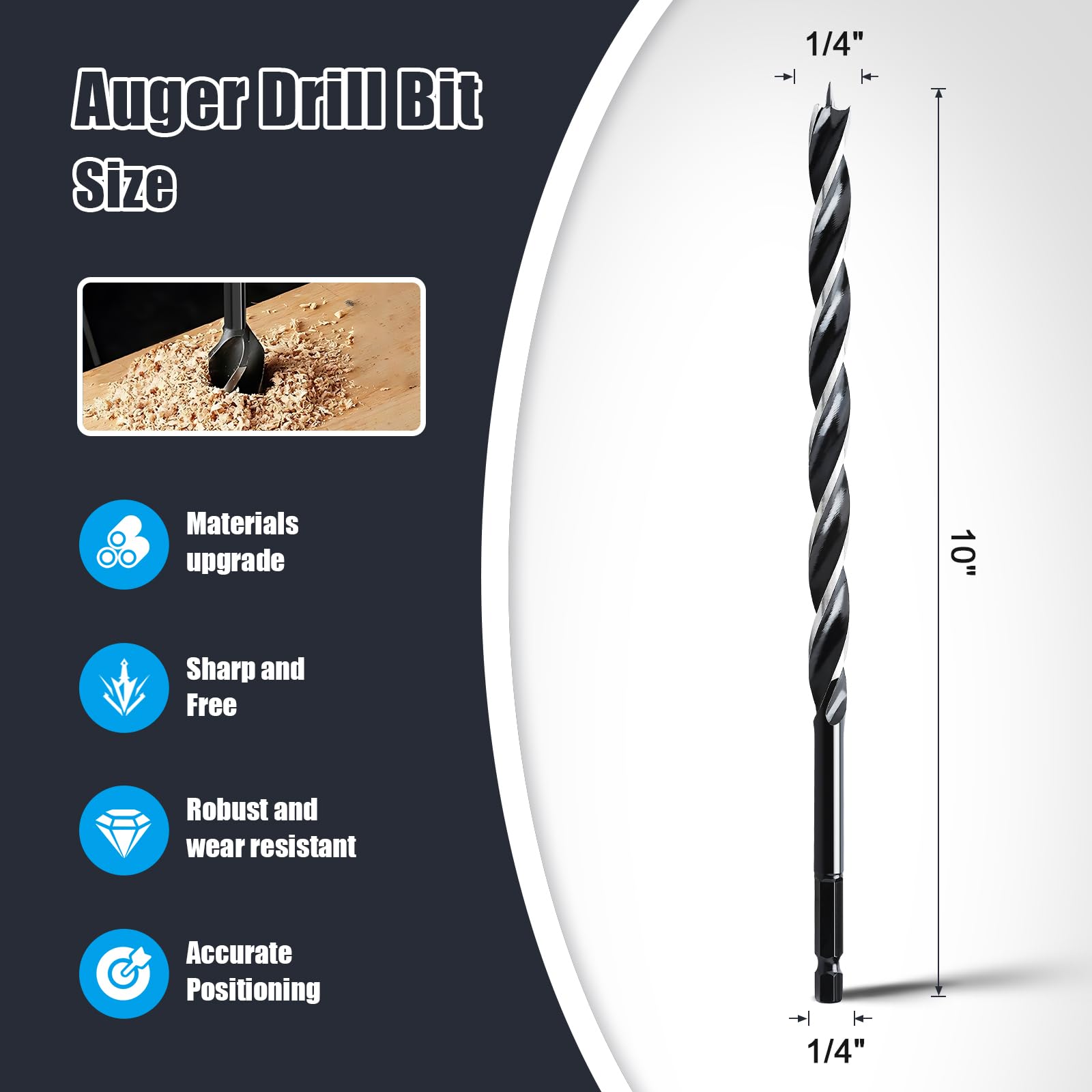 - Auger Drill bit Size: Diameter:1-1/4",Total length:10",Quick Change Hex Shank:1/4".