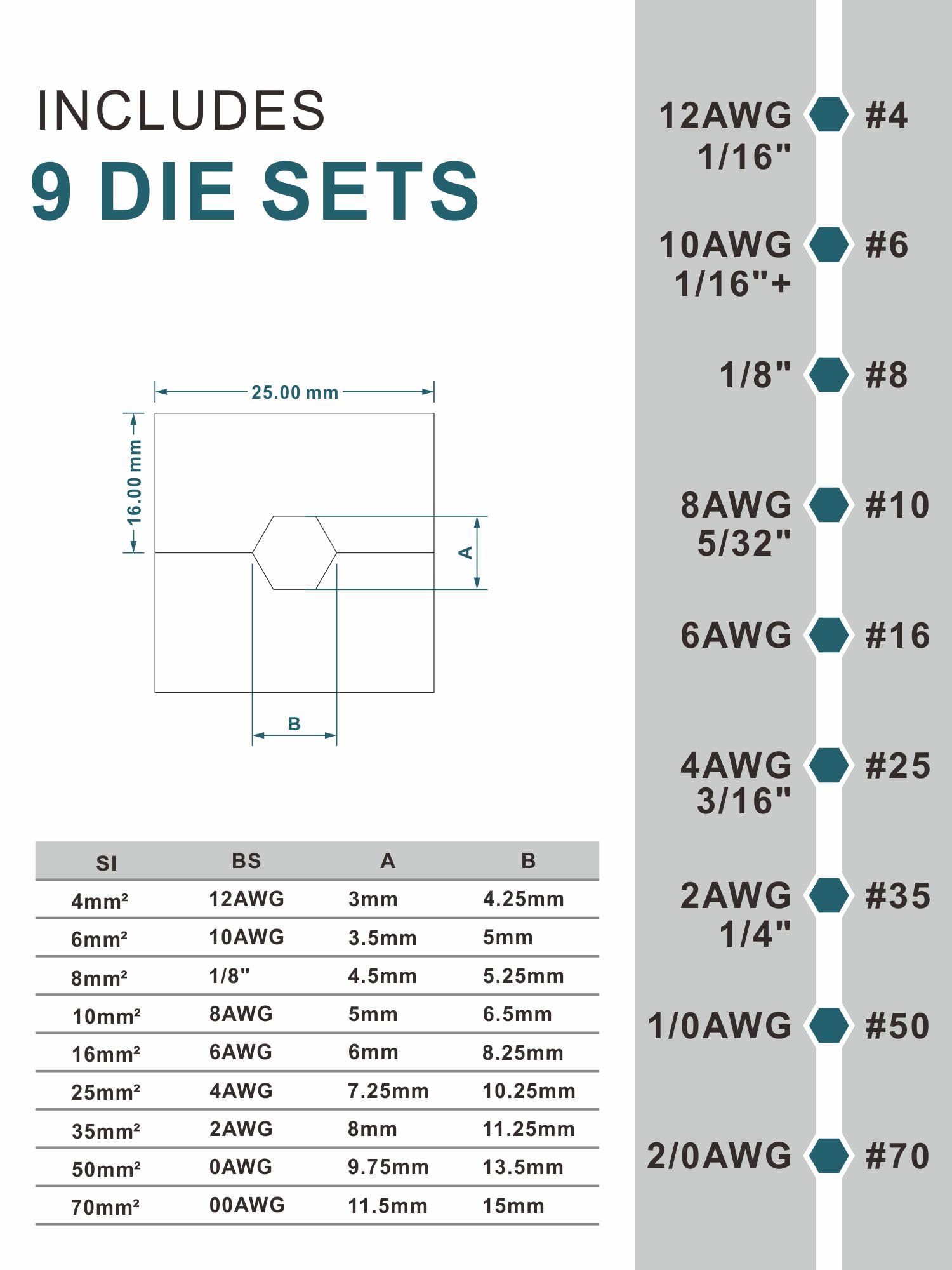 - Hydraulic crimping tool 9 pairs of dies: 12.10.8.6.4.2.1/0. 2/0 AWG and 1/8 "for stainless steel wire rope