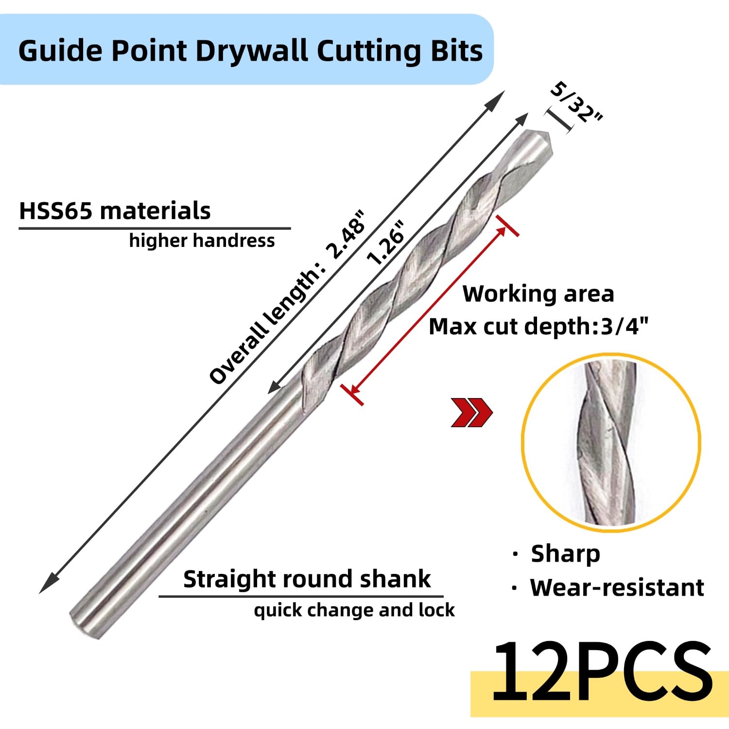 Details: 12 Pieces Drywall Cutting Tools 5/32 Inch Guide Point Cutting Bits,HSS65 Drill Bits, Cutting Drywall, Used for with Spiral Saw and Power Tools