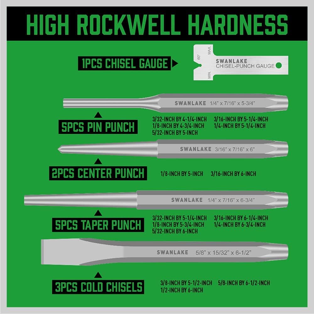 - 5PC Tapered punch: 3/32" x 5-1/4", 1/8" x 5-3/4", 5/32" x 6", 3/16" x 6-1/4", 1 /4" x 6-3/4" and 3PC Cold Chisels: 3/8" x 5-1/2", 1/2" x 6", 5/8" x 6-1/2"