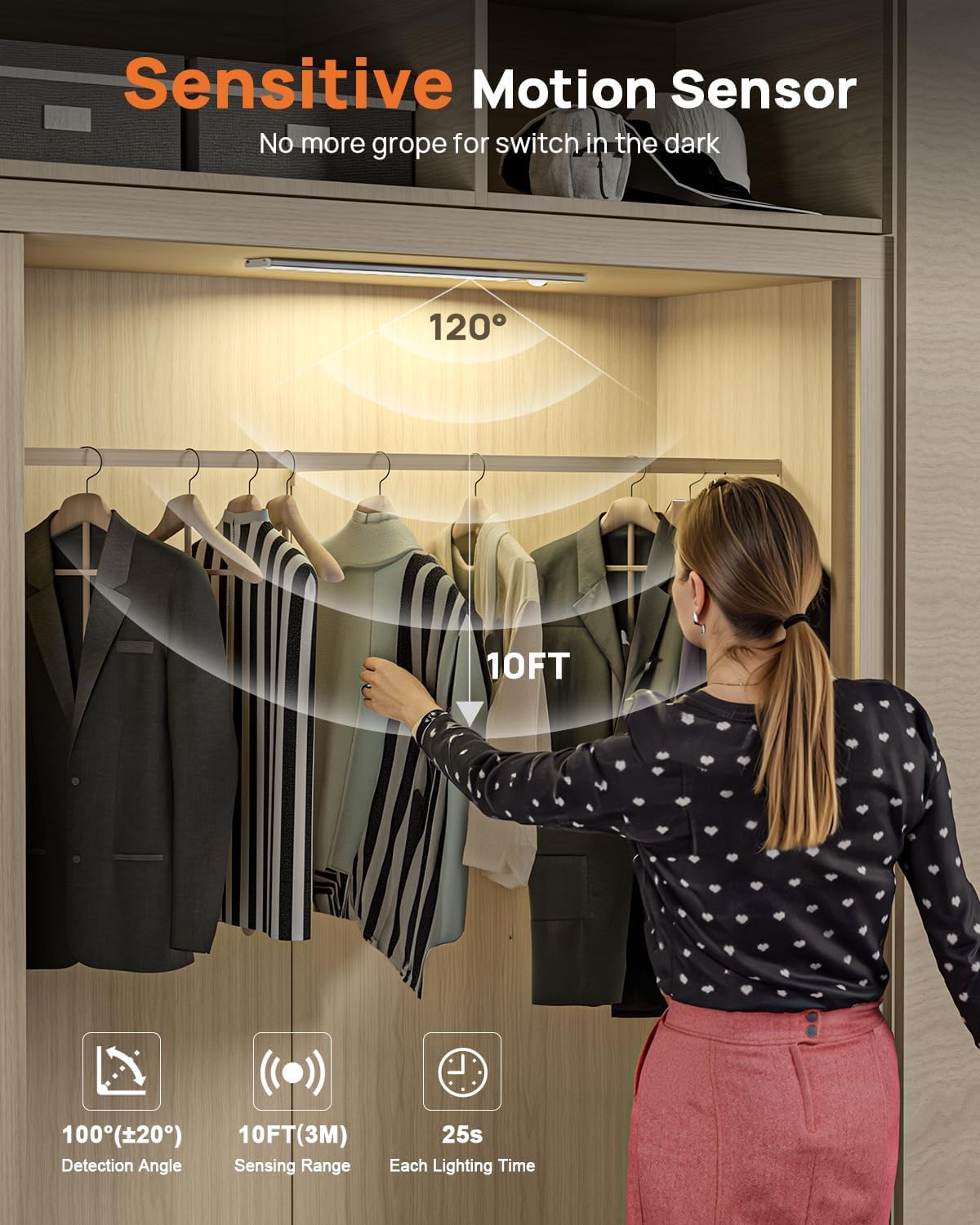 - Wireless Remote Control & 3 Color Temps Dimmable & Timer: This under counter lights comes with remote control within 16ft, allowing you to use easily and effortlessly. These rechargeable under cabinet led lights have 3 temperature dimmable colors light include warm white, natural white and cold white from 2700K-6000K. Our wardrobe light motion sensors also offer 4 time settings of 15Min/30Min/45Min/60Min. Whether for home lighting or commercial use, this under cabinet lights wireless is an ideal choice to enhance comfort and convenience