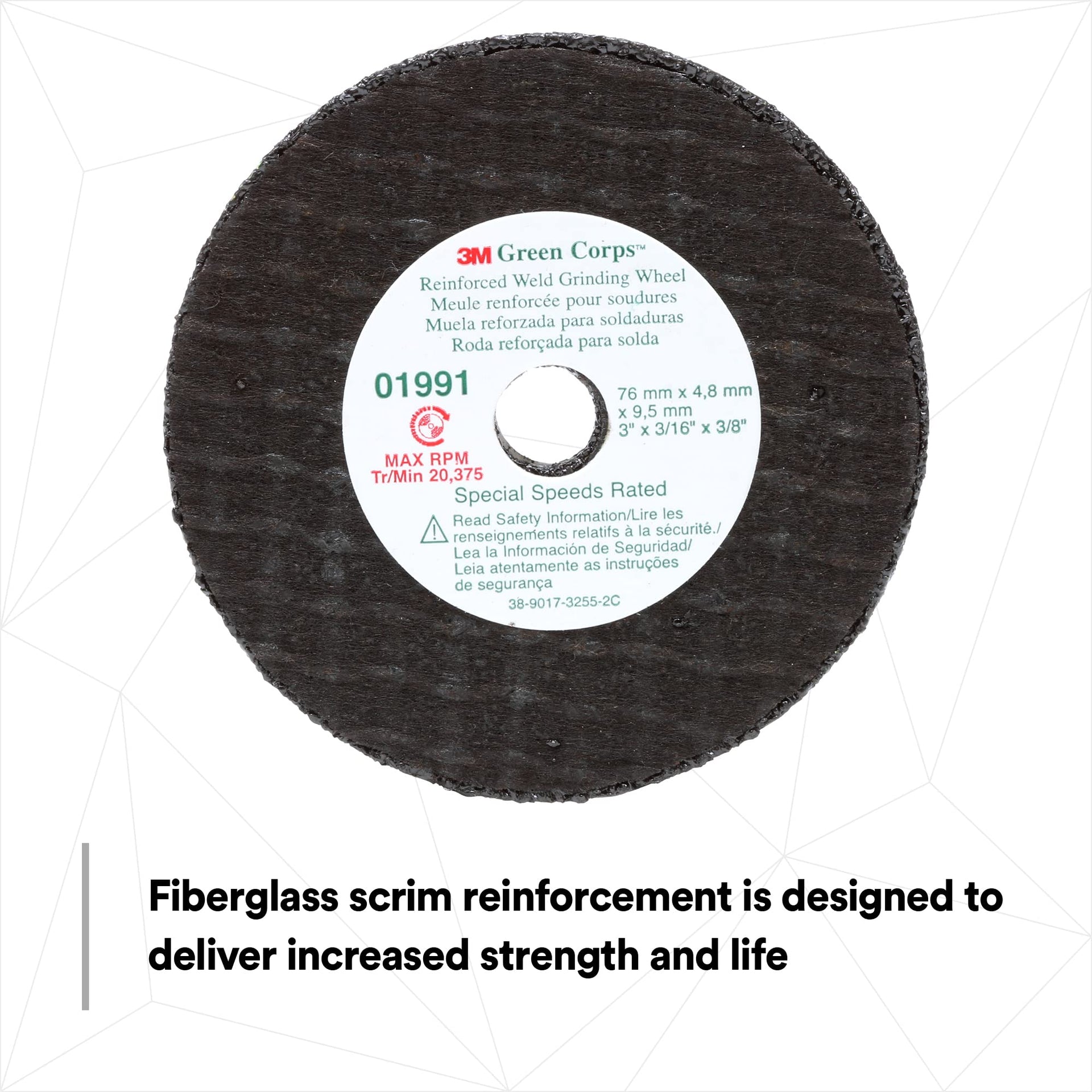 Details: 3M Green Corps Reinforced Weld Grinding Wheel 01991 is designed for tough grinding and weld removal from hard-to-reach areas and internal angles in collision repair. This rigid, heavy-duty 3-inch diameter wheel is 3/16-inch thick and is built with fiberglass reinforcement scrims which help the wheel last longer. The long-lasting aluminum oxide mineral abrasive is heat-resistant and resin-bonded, giving this grinding wheel the durability and strength to cut through a wide variety of materials. The 3/8-inch center hole ensures secure attachment to common grinding equipment. Use at maximum 20,375 RPM. Always use with a wheel guard in place. 3M Green Corps Reinforced Weld Grinding Wheel 01991 makes grinding applications in collision repair fast, reliable, and secure.