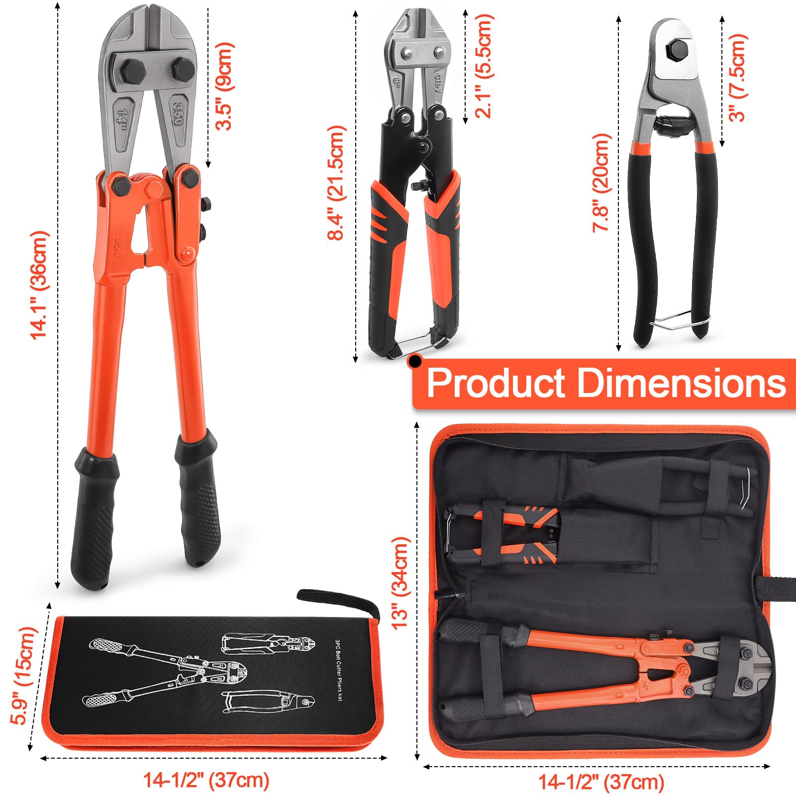 - 【Heavy Duty Performance】The 14" cutter delivers powerful leverage for thick bolts and padlocks; the mini cutter accesses confined spaces; the cable shear cleanly severs steel wire ropes and braided cables without fraying. A must-have tool for mechanics, construction, fencing, and emergency kits