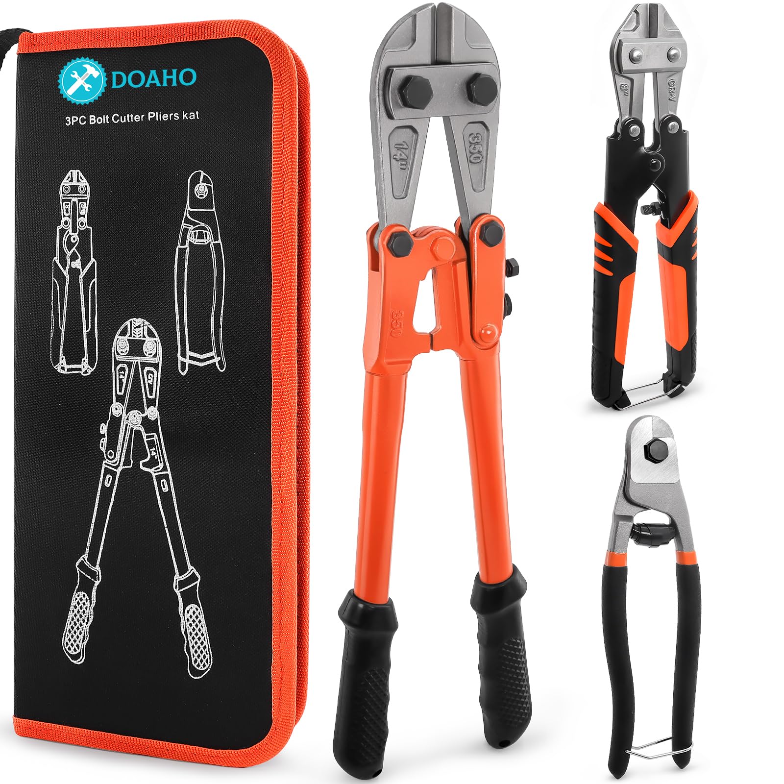- 【Doaho Professional Bolt Cutter Set】This bundle includes a 14-inch heavy duty bolt cutter for large tasks, an 8-inch mini bolt cutter for precise cuts, and an 8-inch wire rope cutter. Ideal for cutting hardened steel locks, thick chains, barbed wire, steel cables, iron rods, and fence wires