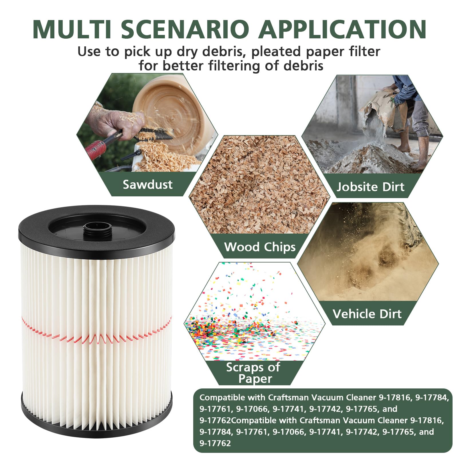 - ใPREMIUM FILTERใ - 9-17816 filter replacement for Shop Vac Craftsman 17816 9-17816 Vacuum Cleaner with heap filter use to pick up dry debris, pleated paper filter for better filtering of debris,works with threaded non-threaded filter cage studs to keep your home clean and comfortable