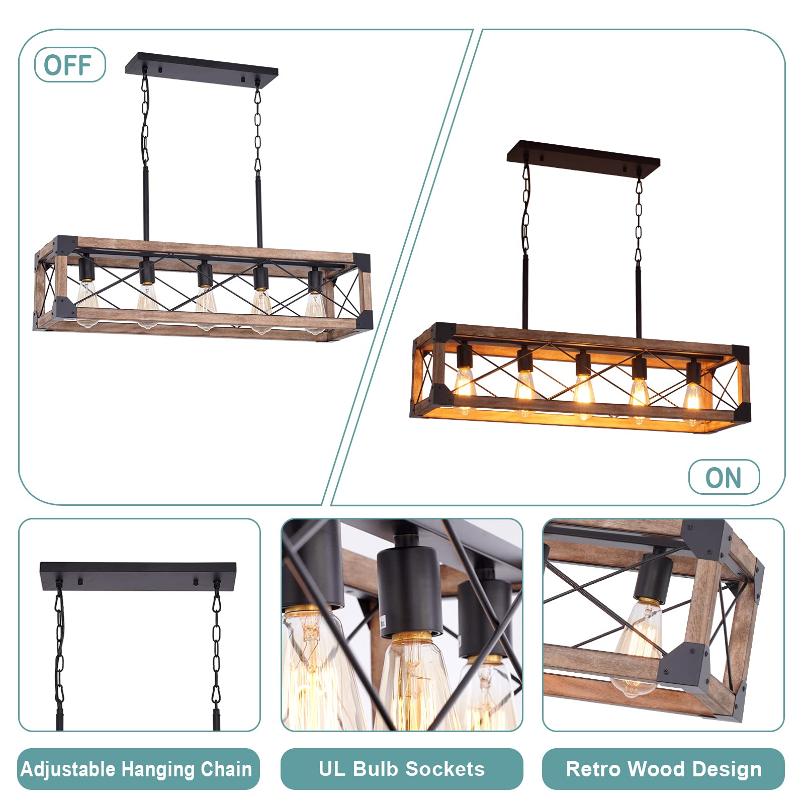 - ❤ RUSTIC FARMHOUSE STYLE : Features a classic iron frame with faux painted wood grain finish. This kitchen pendant lighting is ideal for farmhouse, coastal and transitional style spaces.