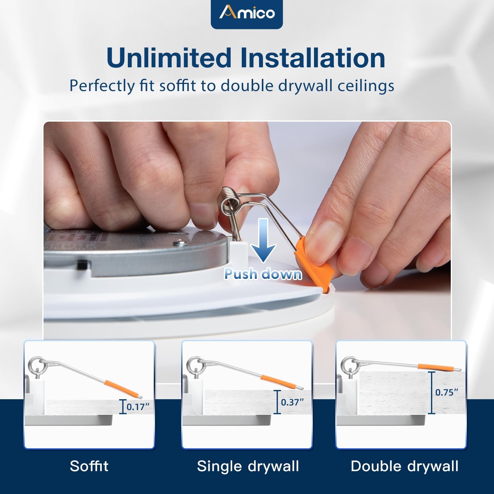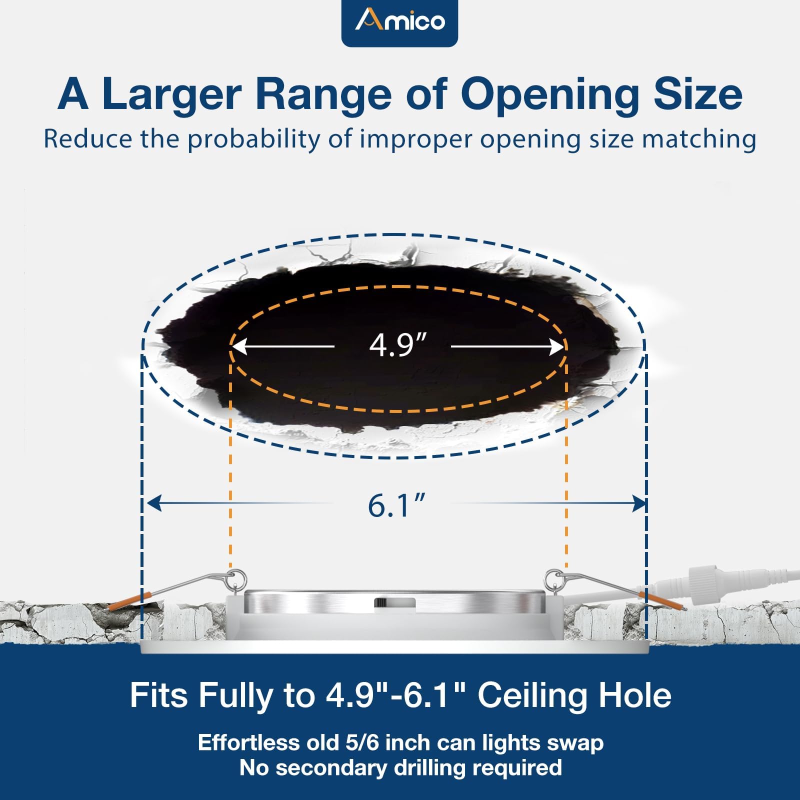 - High Brightness: Amico's 6 inch slim pot lights use the world's leading LED chips with higher lumens and lower power. 1000LM consumes 12 Watts, which equals to 110W halogen lamp, saving you up to 90% in energy costs a year.