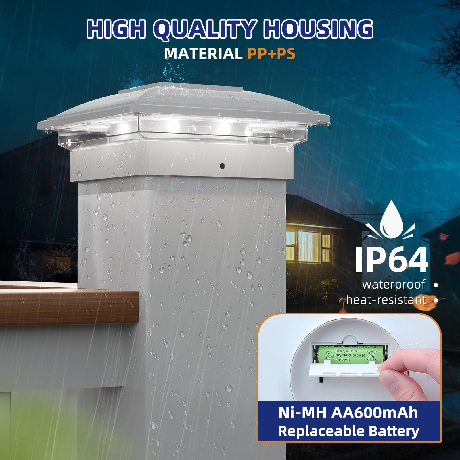 - [IP64 Waterproof & Resistant] - APONUO solar fence post lights are made of high quality pp plastic, which can resist pressure and water, with a waterproof rating of ip64, sealed well and will not rust, ensuring that the solar post lights can be used for a long time in outdoor waterproof