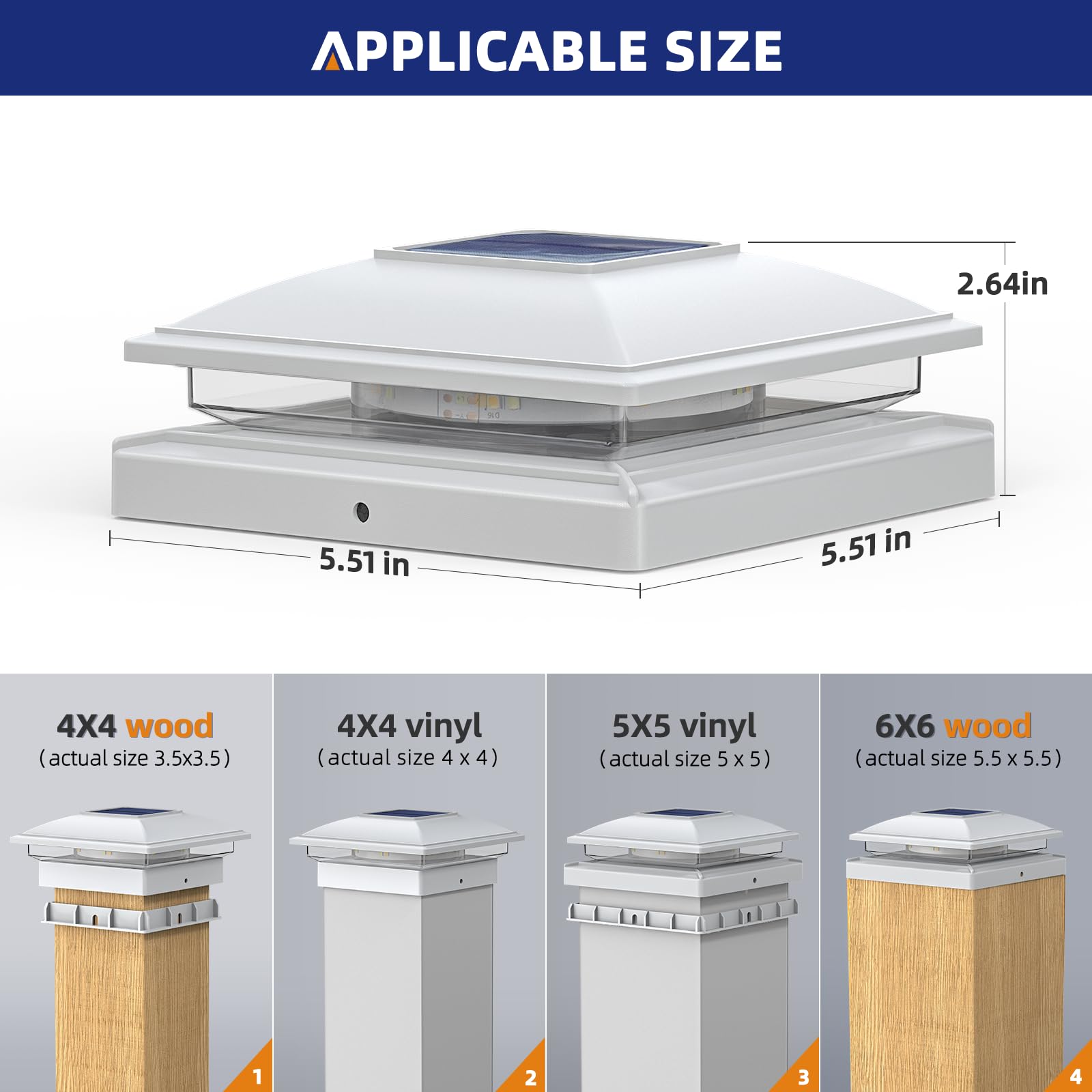 - [Applicable Size ]- APONUO solar post cap lights measures 5.71x5.71x2.64 inches, comes with screw fittings and different sizes of bases. You can mount the 4x4 post solar lights on 4x4,6x6(actual 3.5x3.5,5.5x5.5) inchs wooden post caps,or you can mount aponuo fence post solar lights on 4x4,5x5 (actual 4x4,5x5) inches vinyl posts