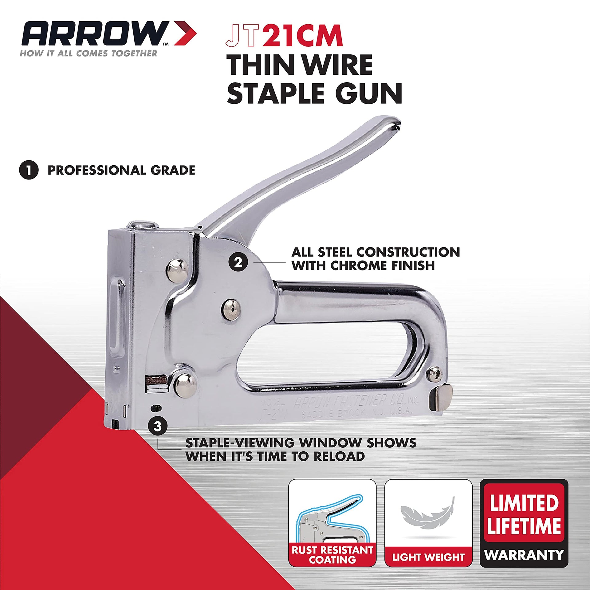 Details: For light duty projects on the job, Arrow’s Professional Light Duty Staple Gun is a great addition to any toolbox or workshop. Of course, the term 'light duty' refers to the scale of the projects, not the strength of the staple gun- which is built with the same quality as all Arrow tools. With a sturdy all-steel body and chrome finish, the JT21CM is ready to get the job done. Compact and lightweight, this tool works with all sizes of JT21 Staples. Perfect for upholstery, screen repair, and professional light duty projects.