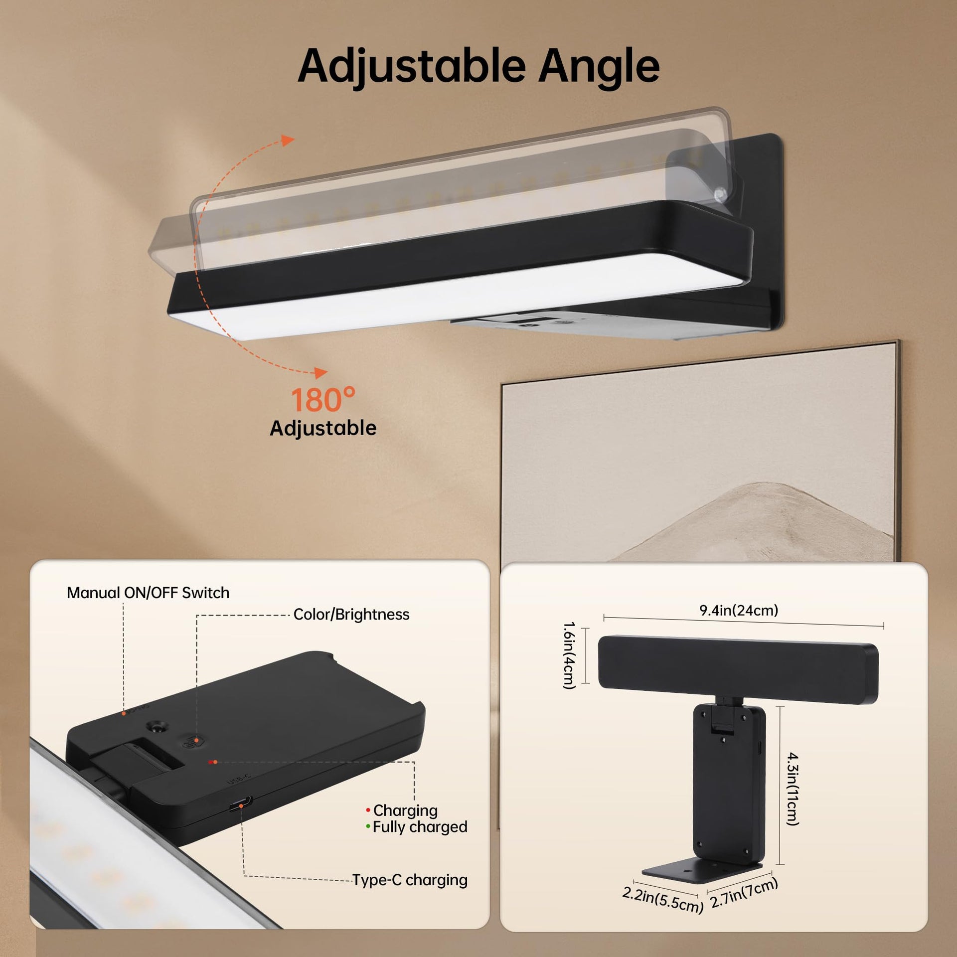 - 【Long-lasting Rechargeable Picture Light】: 9.4" cordless wall sconce for living room, Detachable and rechargeable, built in a long-lasting 6000mAH rechargeable battery. Fully recharges in just 5-6 hours; After charging, the battery life:100% brightness: 10 hours, 50% brightness: 20 hours,10% brightness: 48 hours.