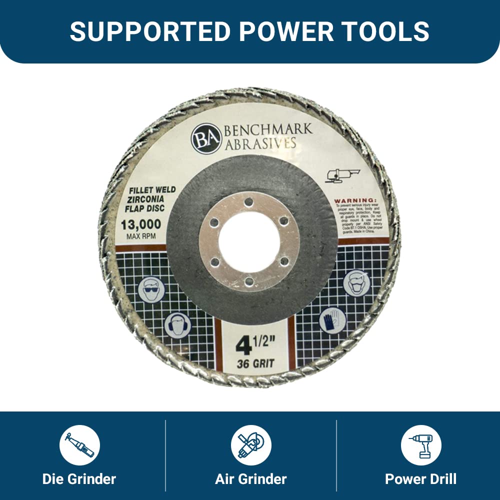 - Benchmark Abrasives 4.5” curved zirconia flap discs are ideal for finishing fillet welds, weld splatter, finishing, blending, deburring, cleaning, etc.