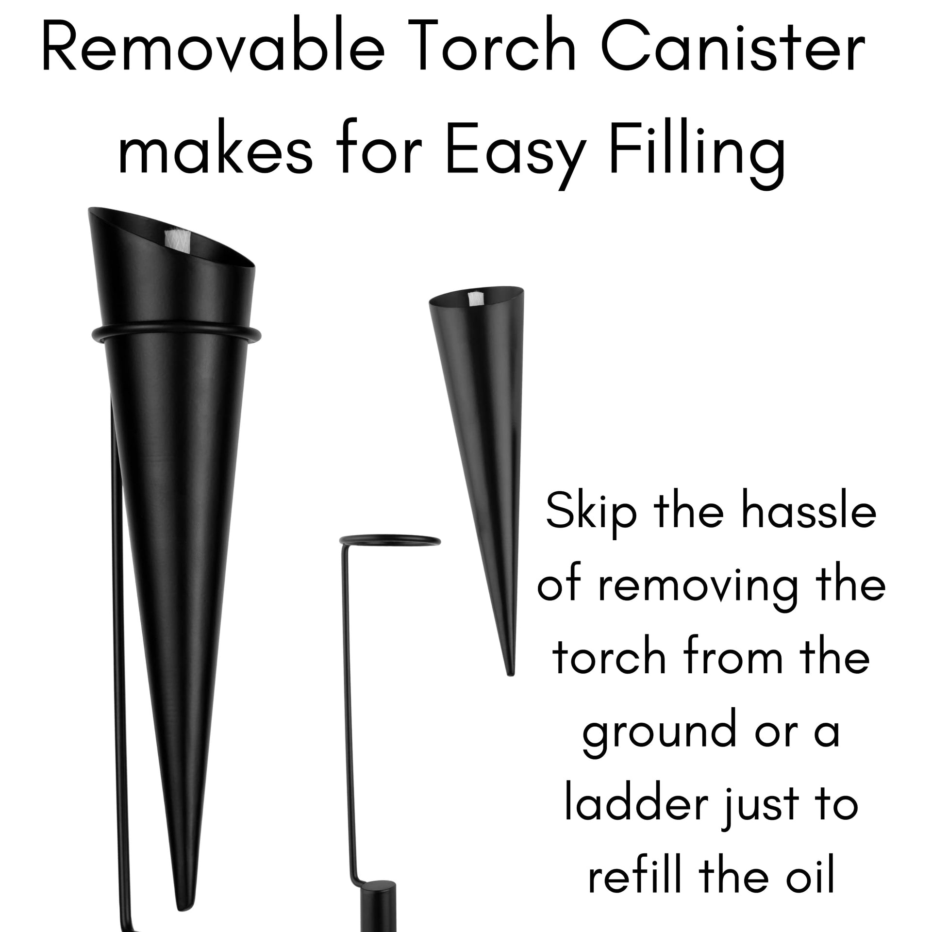 - EASY TO REFILL & USE: Featuring an extra-wide mouth, these torches make refilling with citronella oil (OIL SOLD SEPARATELY) simple and spill-free. Each torch includes a wick cover/snuffer to protect the wick and safely put out the flame. Sharp stake bottoms make them easy to install in soil or grass.