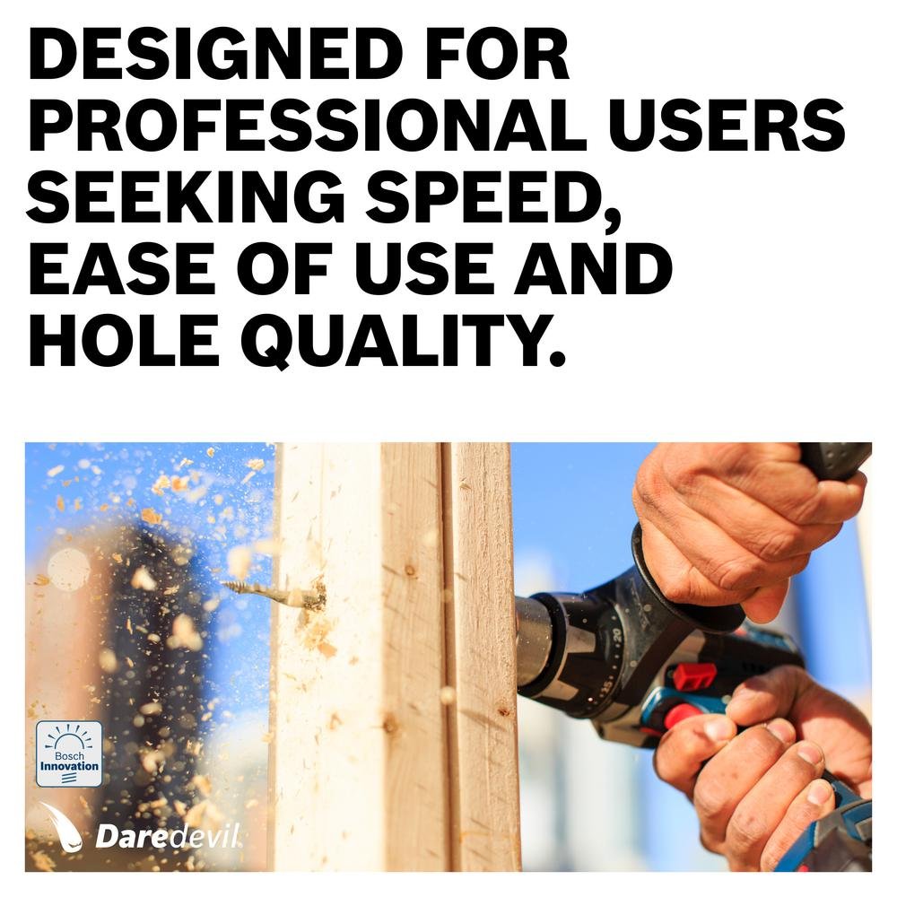 Bosch DareDevil Spade Bits offer the industry's leading performance over any other spade bit available today. The DareDevil was designed to answer the needs of professional users in terms of speed, ease of use and hole quality. The DareDevil is the fastest spade bit in the industry, provides smooth and effortless drilling, and produces the cleanest hole. A first for Spades, the full cone threaded tip provides the speed needed to drill faster and it pulls the bit through the material with less effort and vibration than other spade bits.