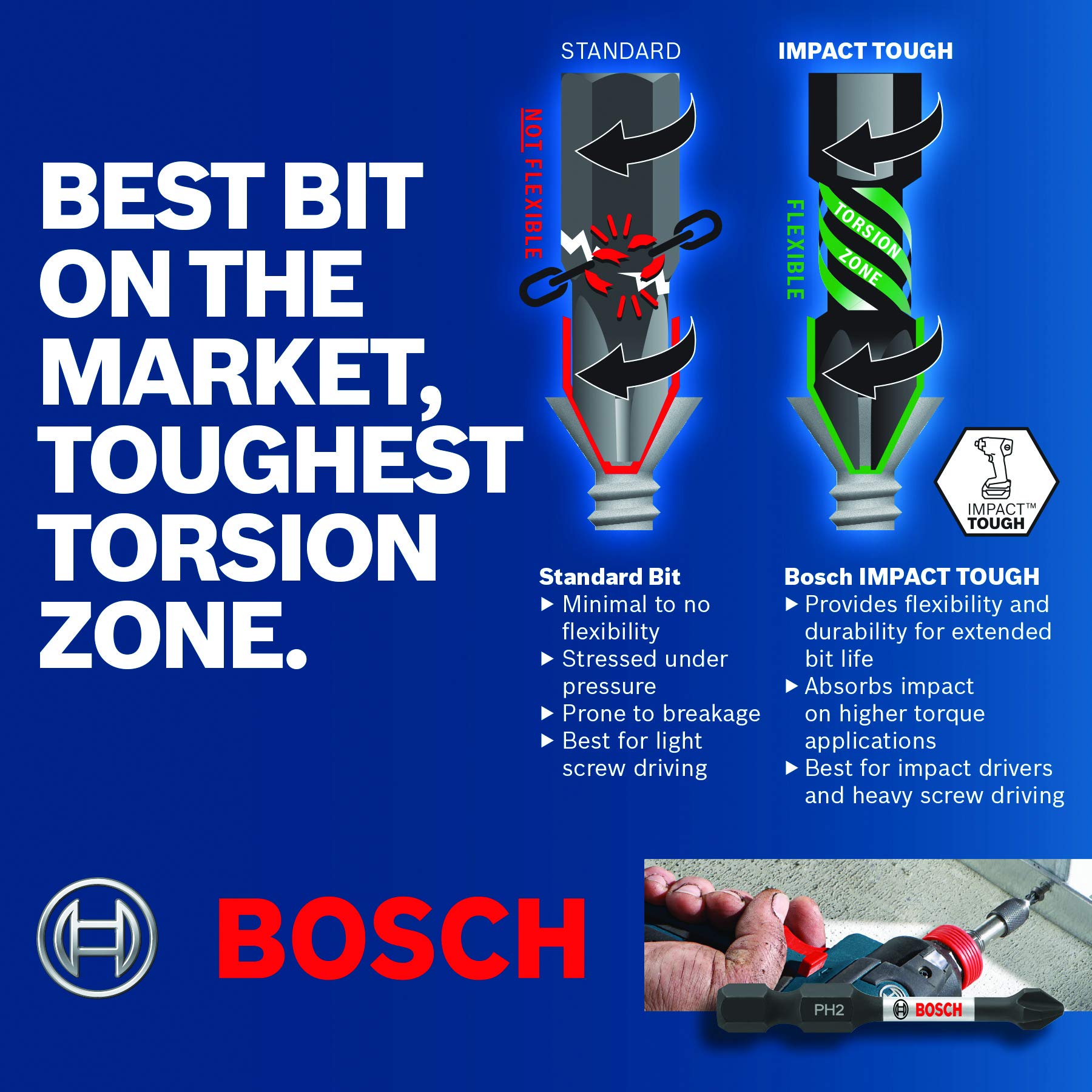 Details: Bosch impact tough impact driver bits have been upgraded to deliver 10x life over standard impact bits. With an xtended torsion zone, precision engineering and heat-treated manufacturing process, These bits deliver tough torque and power for longer – and with less CAM out. These impact tough bits are an impact-rated line of screw driving bits, double-ended bits, nutsetters, sockets and bit holders that have been enhanced to handle a new generation of higher torque impact drivers. These bits also come with high-visibility sleeves for greater user convenience.