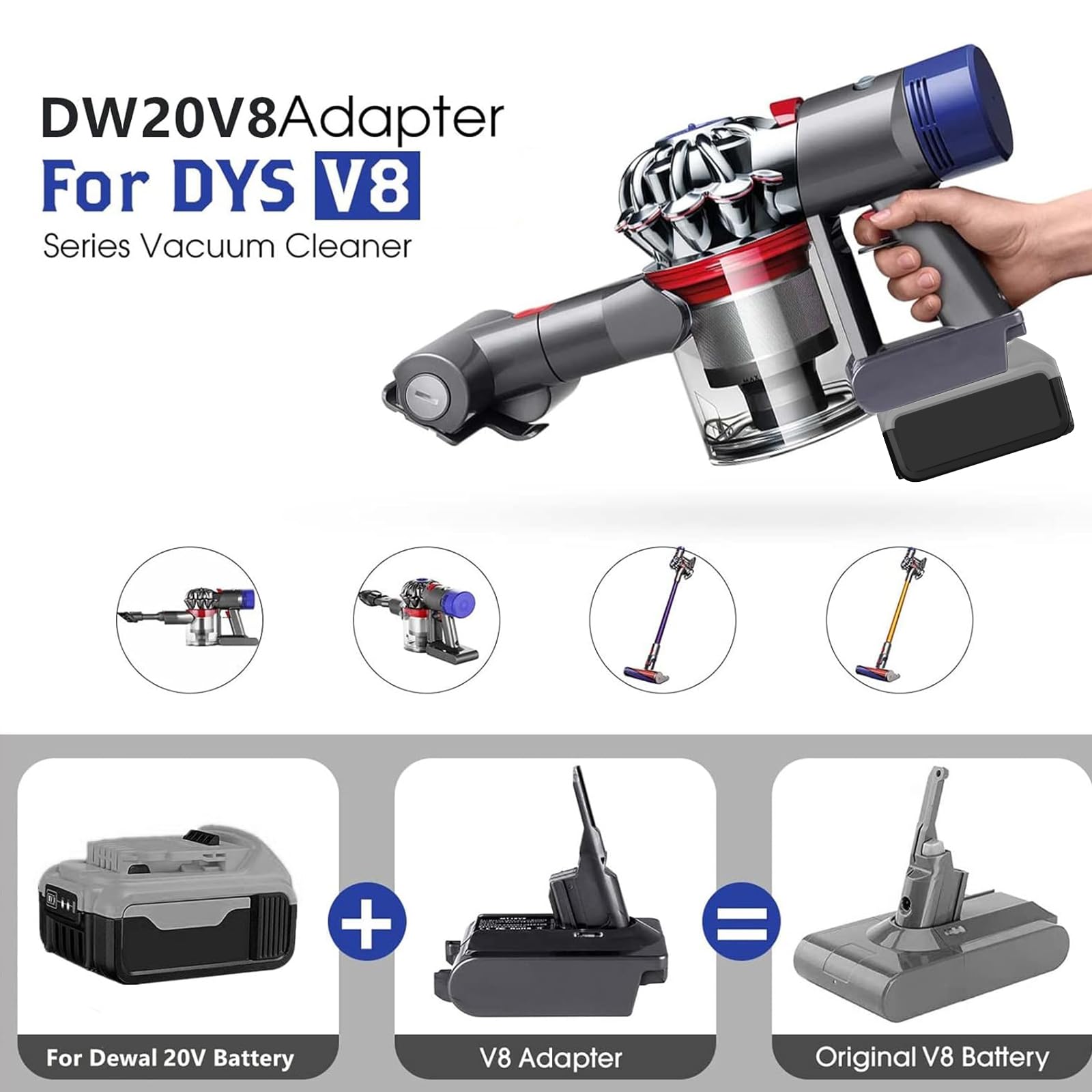 - đăDW20V8 Adapter AdvantageăThis adapter enables the listed lithium batteries to be used on for Dyson V8 tools, and lets you enjoy the benefits of extended operating time of lithium-ion batteries on existing for Dyson tools.