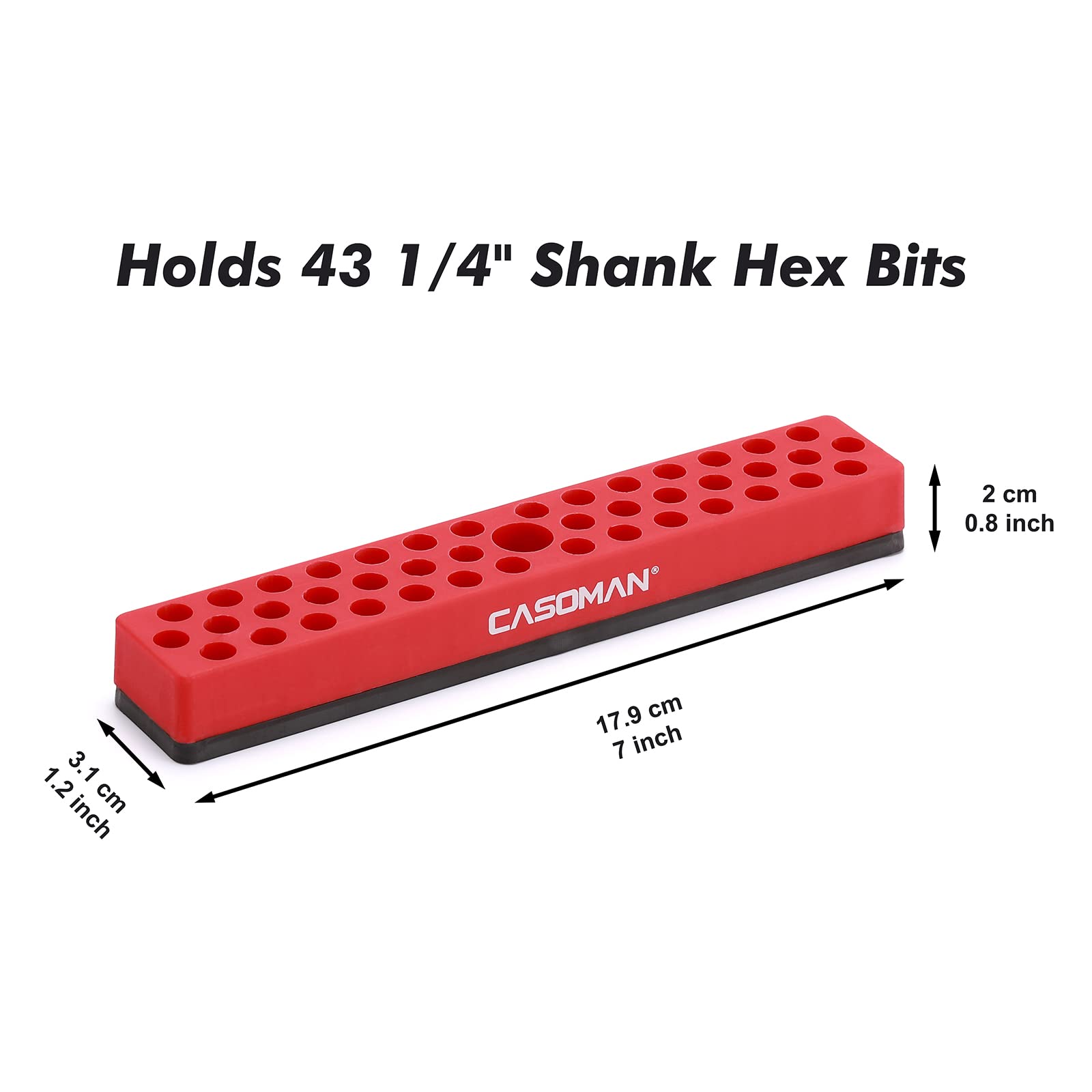 - This red bit holder securely holds up to total 43 pcs 1/4-inch hex bits with size of 7"*1.2"*0.8".