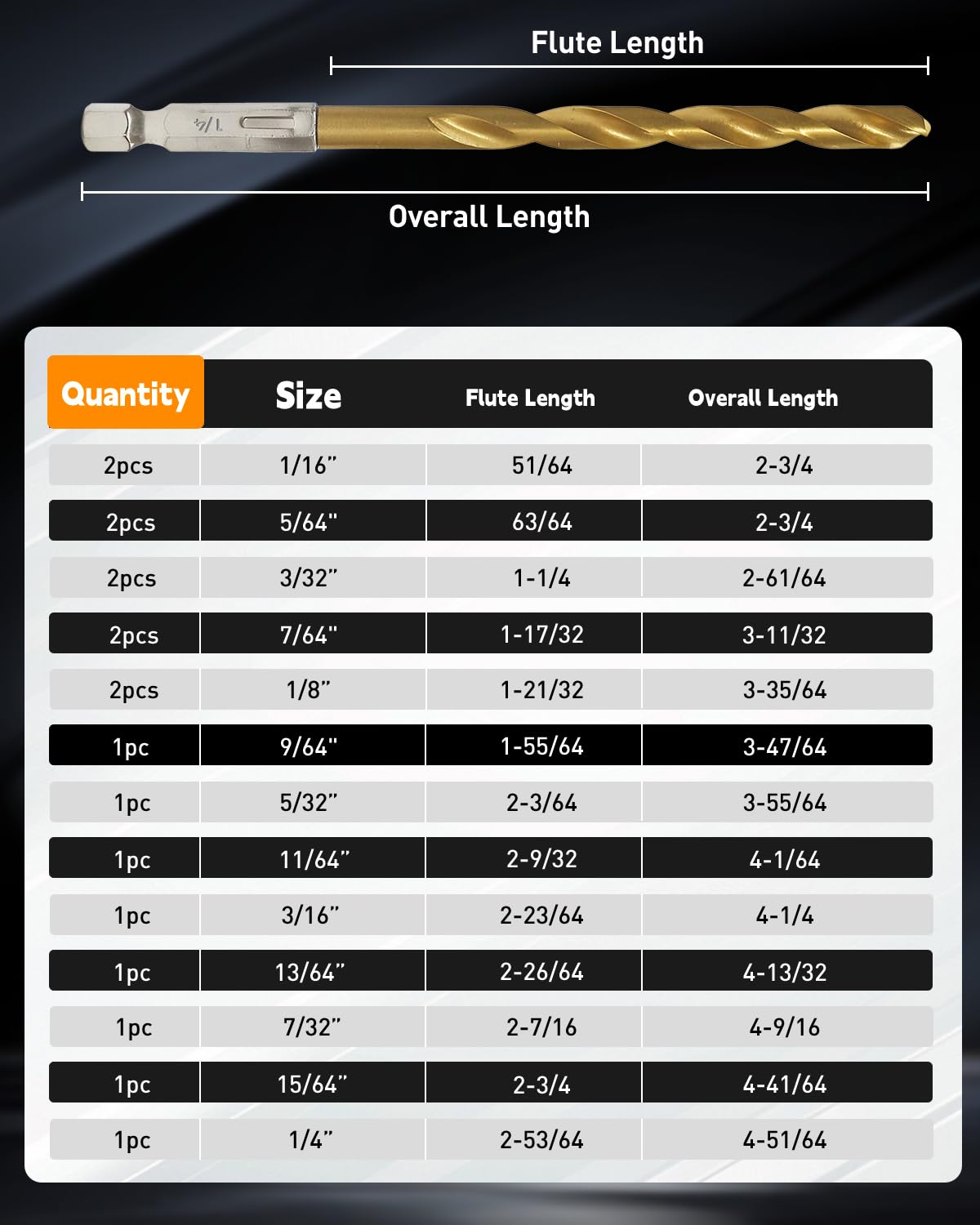 - Quick Change - 1/4 inch hex shank fits into all power tools more easily and securely, specially for locking into quick change chuck.