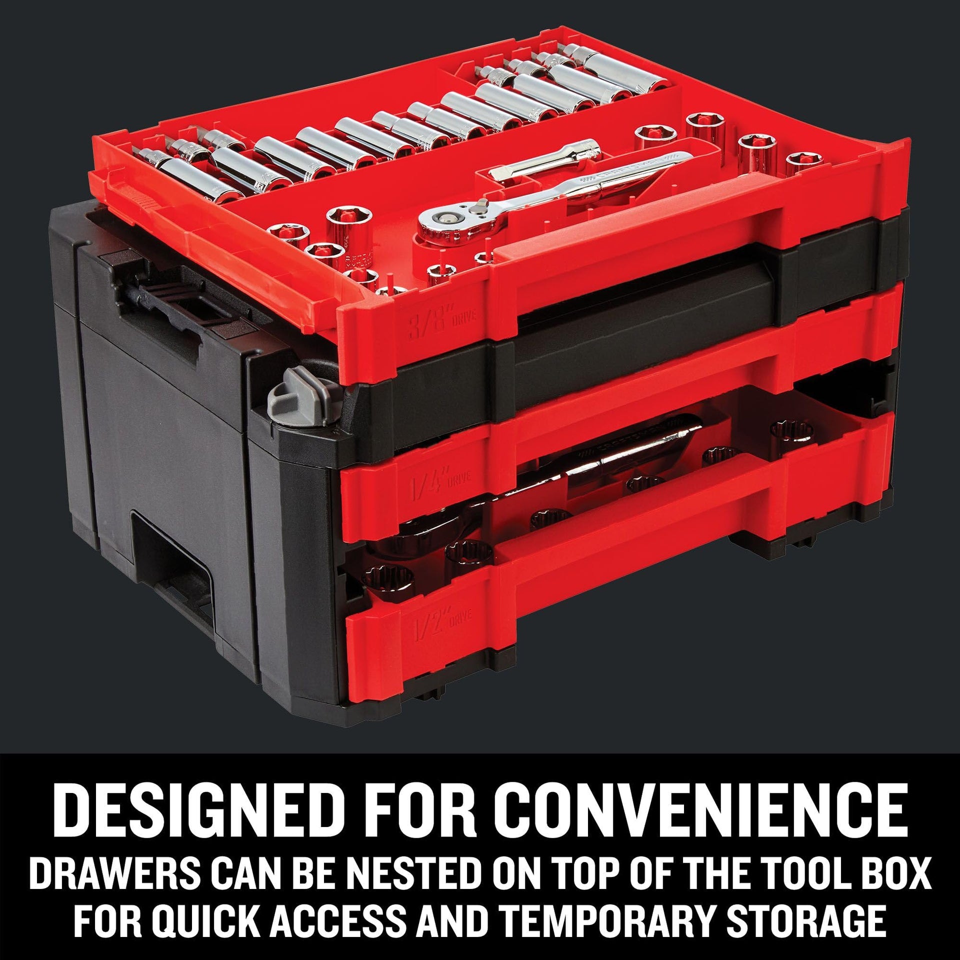 Details: This all-in-one 3-drawer mechanics' 262-piece tool set will help your garage or workshop run like a well-oiled machine. Auto enthusiasts and master mechanics alike will appreciate 1/2 drive socket set, 1/4 drive socket set, 3/8 drive socket set the low profile 1/4-in., 3/8-in. and 1/2-in. drive 72-tooth ratchets with 5° arc swing. Designed for security and ease of use, its drawer lock dial quickly anchors the drawers in place when not in use to help prevent contents from falling out. We’ve also incorporated a drawer stop system that allows drawers to be easily removed. Drawers open with one hand and can nest on top of the box for easy access and temporary storage. Compatible with the CRAFTSMAN VERSASTACK storage platform allowing for many different combinations of storage solutions * 1/4" dr & 3/8" dr only as compared to cmmt81747, CMMT81748, & CMMT81749