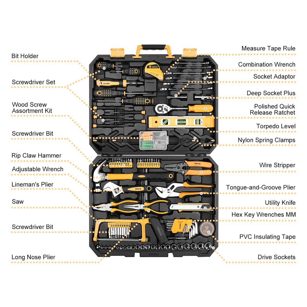 - INCLUDES:Comprehensive assortment of professional-grade wrenches, ratchets, a complete range of 1/4 inch and 3/8inch metric-sized sockets and precision screwdriver, hammer, tape measure, pliers, wrench,and etc. The 72-tooth ratchet easily shift to change direction by flick of 5-degree switch.Variety of 1/4-inch screwdriver bits: Phillips, slotted, square, star and pozi.Also includes soft-grip handle on screwdriver, plier, srtipper and hammer provides excellent comfort and control