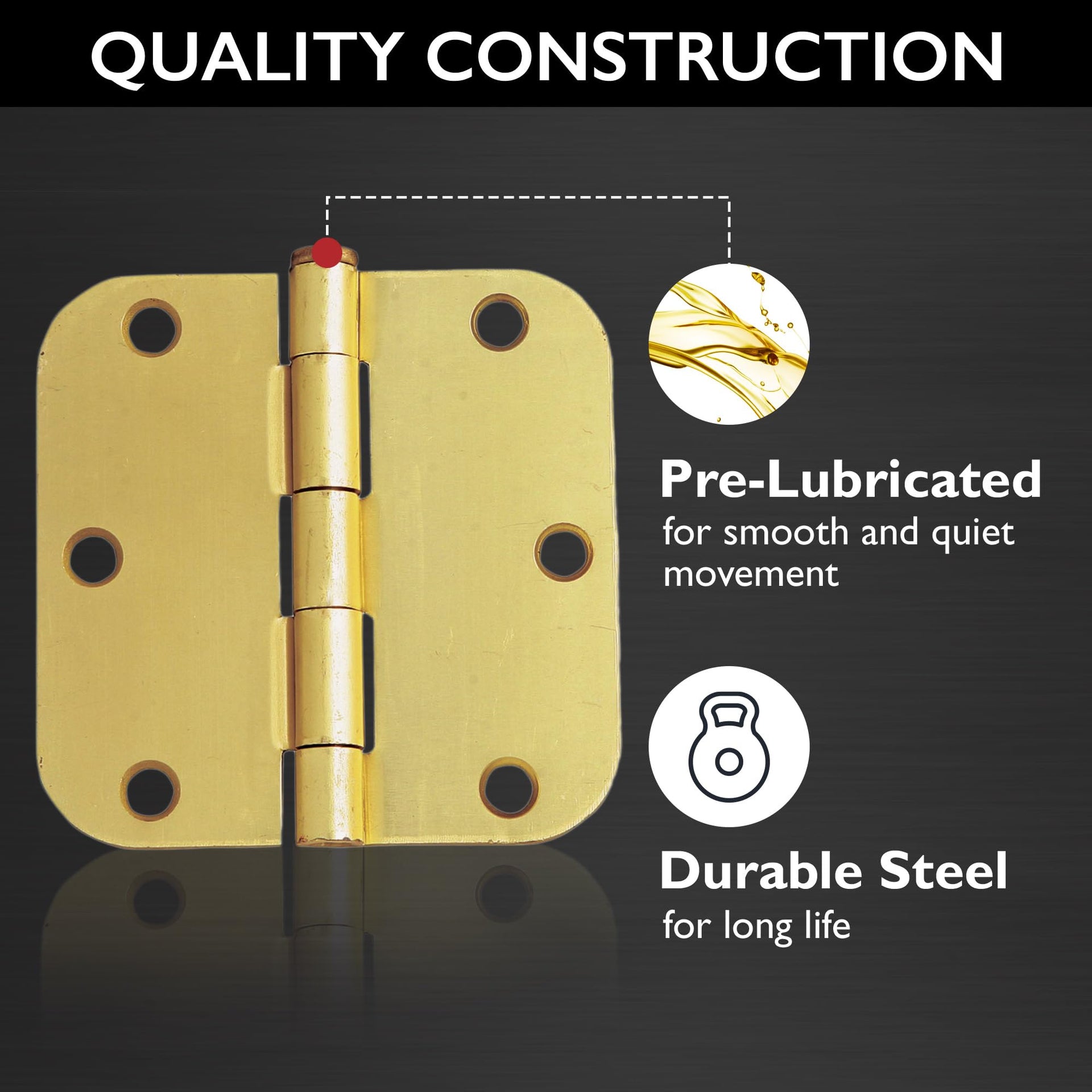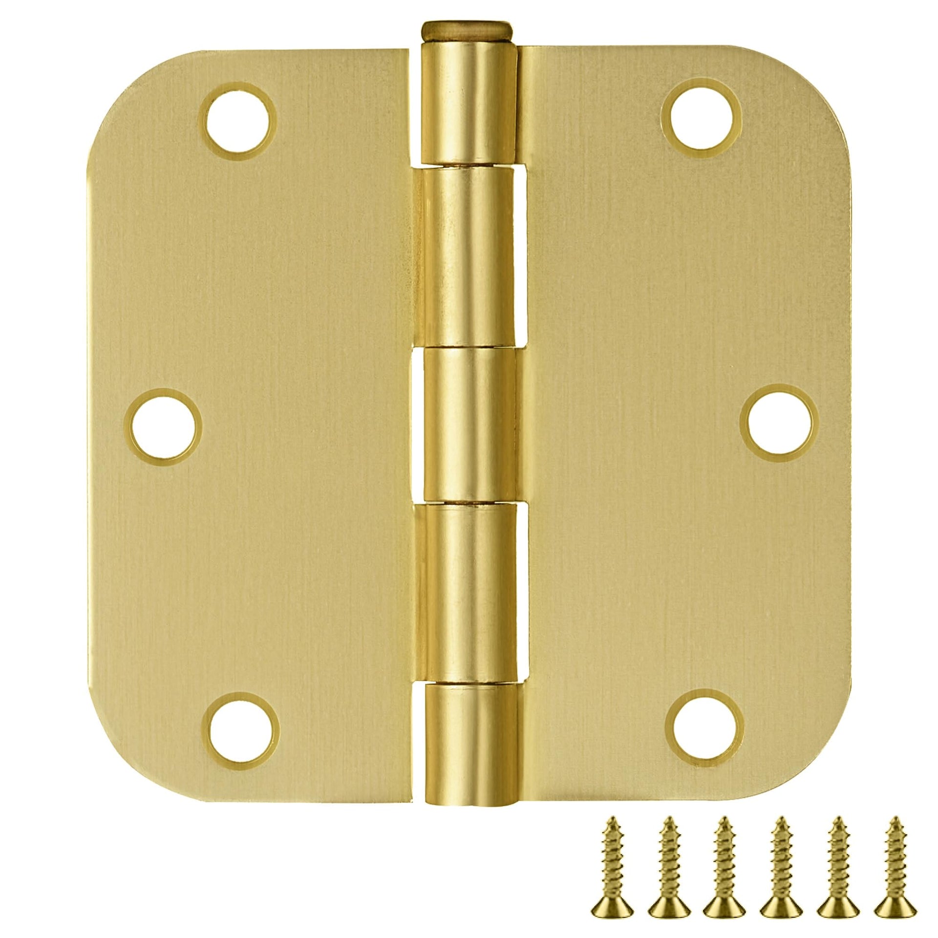 Details: The Design House Door Hinge is 3-1/2-inches with a 5/8-inch corner radius, comes in a 3-pack, and features a classic satin brass finish that blends seamlessly with any residential wooden door. Each hinge is crafted with durable steel for enhanced reliability and long-lasting usage, perfect for keeping residential doorways secure. This 3-pack includes mounting screws for simple installation and a removable pin to remove the door without unscrewing the hinge. This product is functional, effective, and designed with convenience in mind with its water-resistant construction, pre-lubricated pins to prevent squeaking, and its ability to be used on left or right-handed doors. Designed and manufactured by Design House, the trusted source for quality lighting, hardware, plumbing, kitchen, and bath products for every taste and budget.