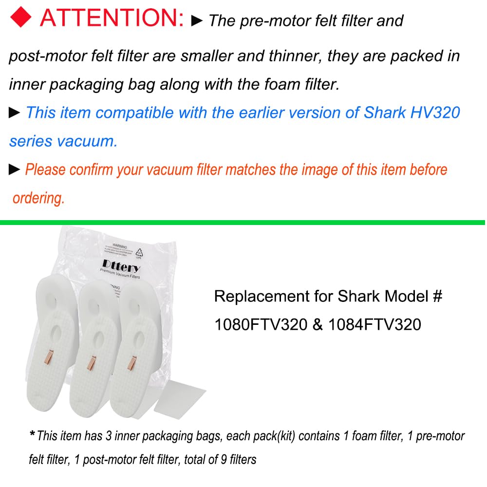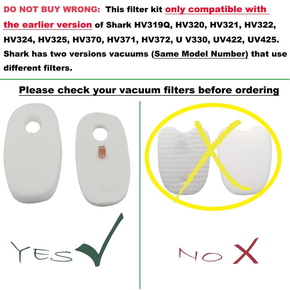 Details: DO NOT BUY WRONG: This filter kit only compatible with the earlier version of Shark HV319Q, HV320, HV321, HV322, HV324, HV325, HV370, HV371, HV372, U V330, UV422, UV425. Shark has two versions vacuums (Same Model Number) that use different filters.