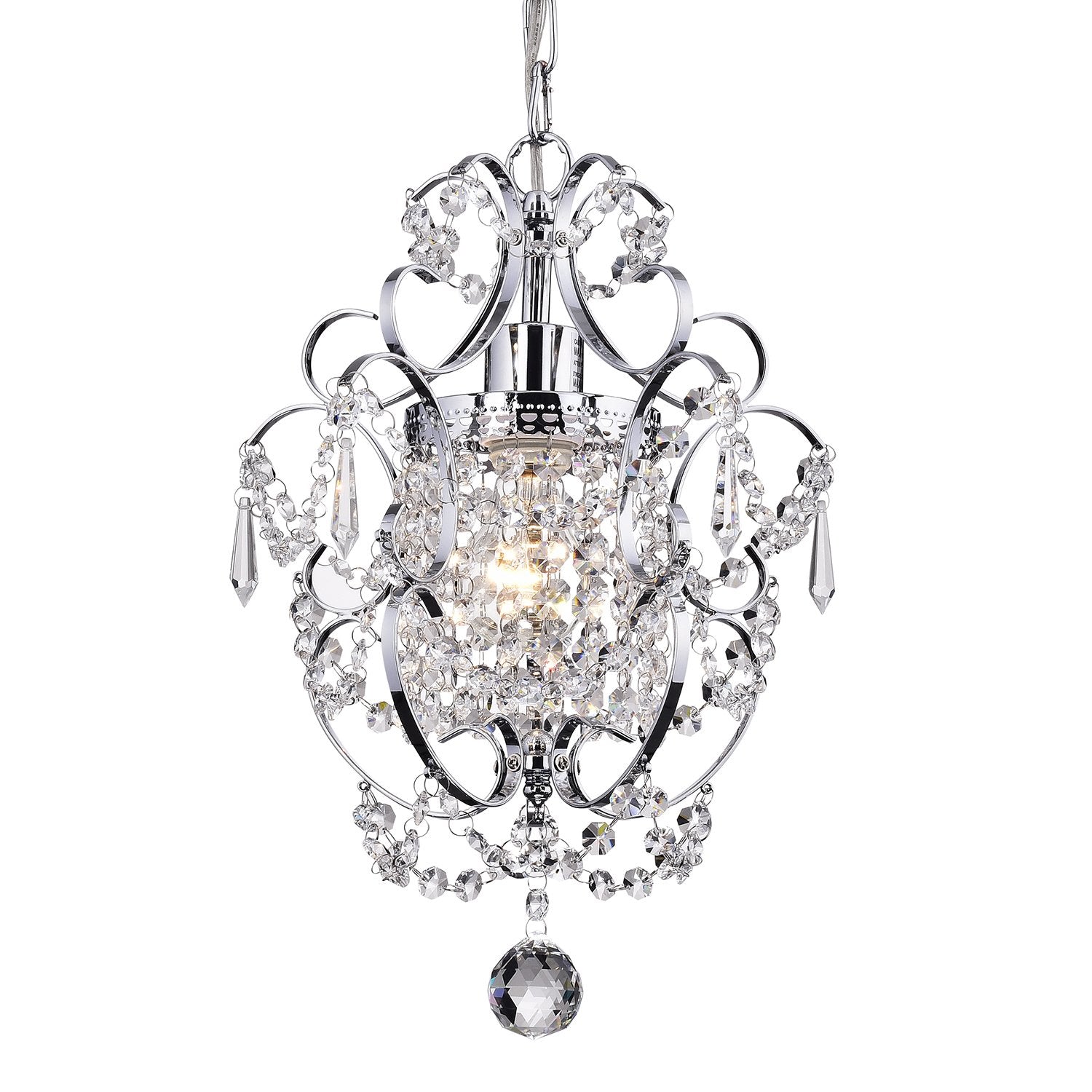 - GLAM DESIGN: Strands of high quality intertwining glass crystals mix with the chrome hardware and surround the single bulb to make this small chandelier a focal point.