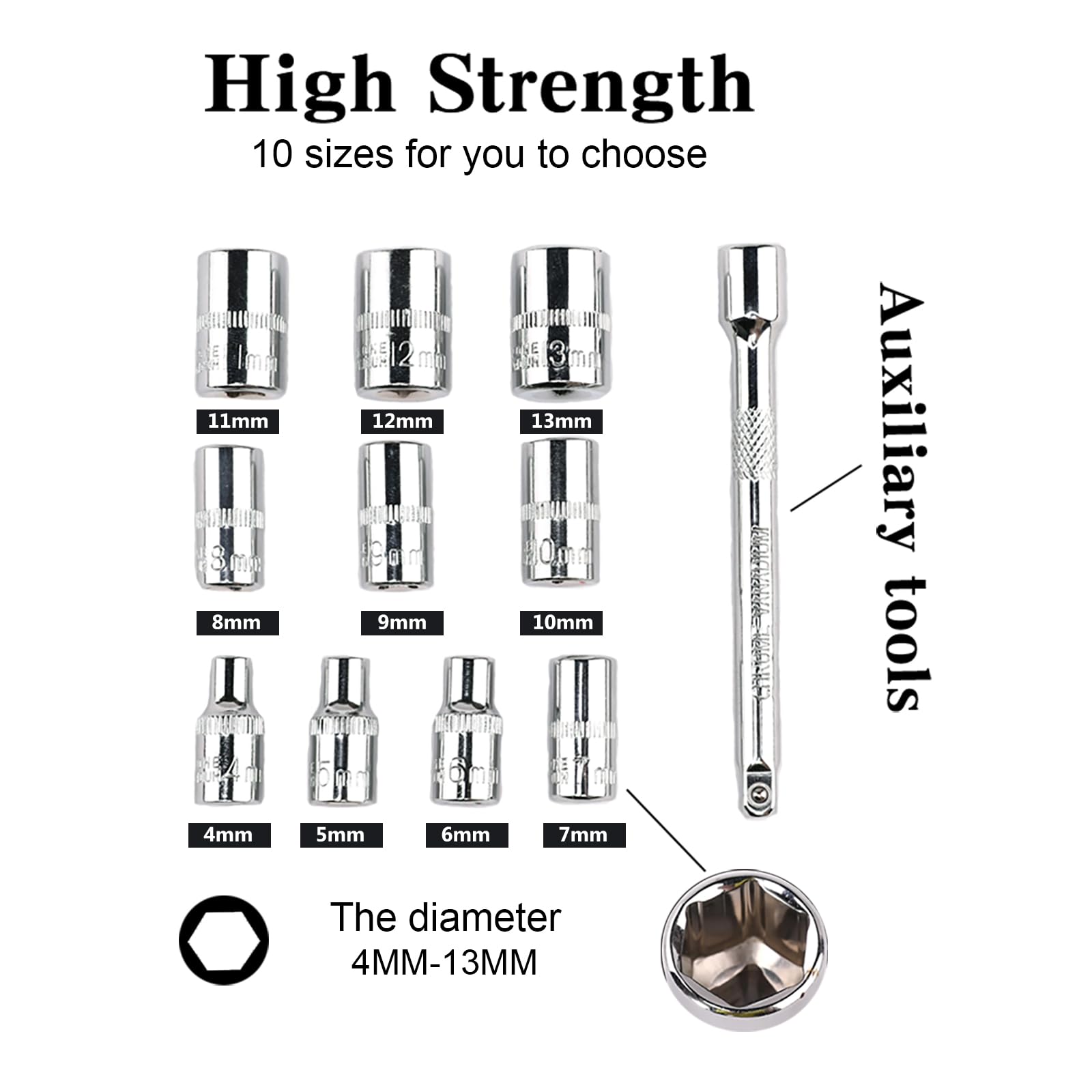 - SMALL BUT ENOUGH FOR YOU - Mini socket set Includes 10 Cr-V 1/4" Metric Sockets 4mm, 5mm, 6mm, 7mm, 8mm, 9mm, 10mm, 11mm, 12mm, 13mm on 10 collecting holders, each socket is labeled with the size which makes organizing easy. 1pcs 1/4" 24-teeth ratchet handle; 1pcs 4'' Extension bars.
