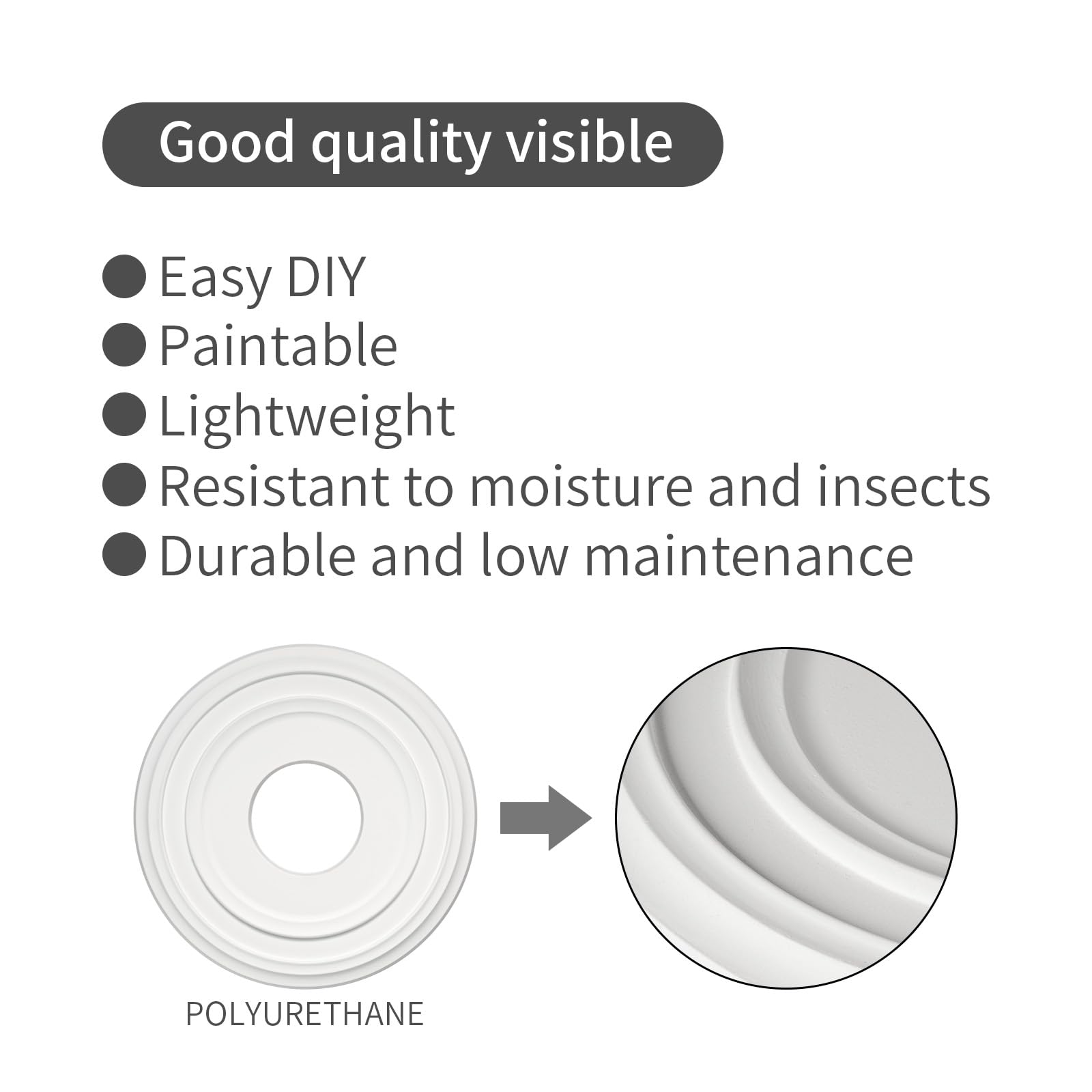 - Ceiling medallions of PU material, PU and PVC: high temperature resistant PVC-60°, PU-90°; abrasion resistance PU>PVC, longer service life and more durable; compressive and waterproof, light weight, easy to install.