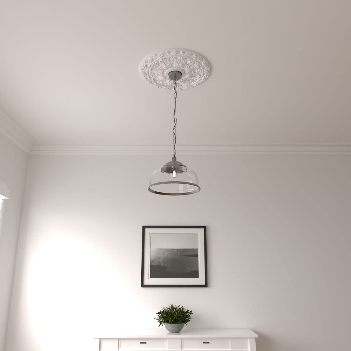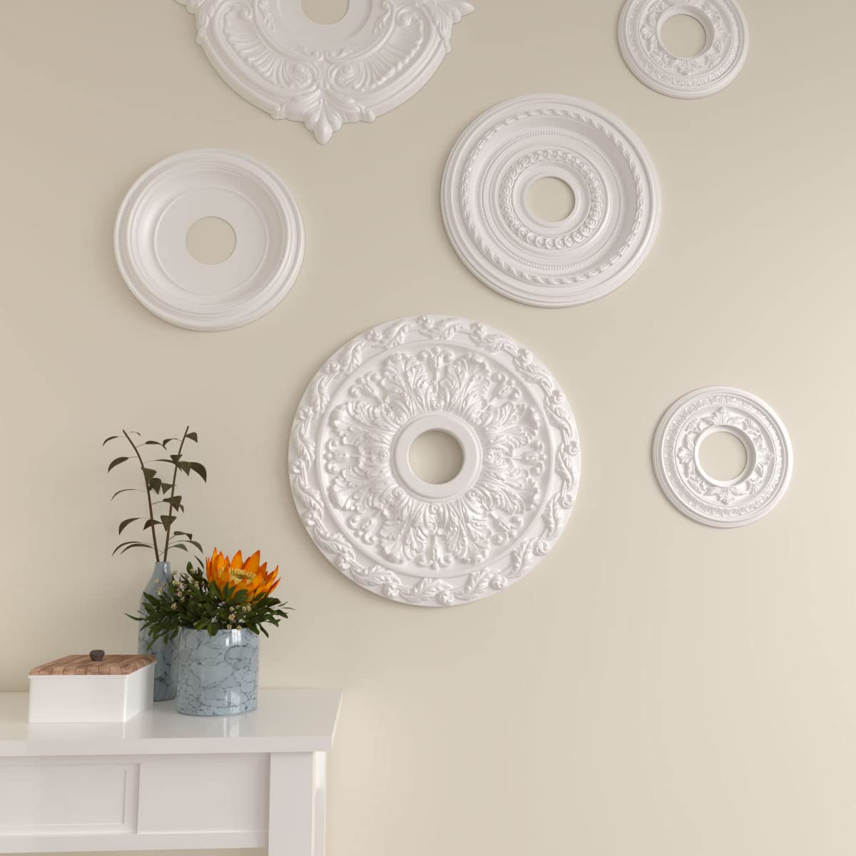 Details: Transform any ceiling into a statement piece with our premium decorative ceiling medallions. Crafted from durable, lightweight polyurethane, these ceiling accents deliver a timeless look at a fraction of the cost. Each ceiling medallion is easy to install using standard woodworking tools and adhesive, instantly adding elegance to your chandelier, ceiling fan, or light fixture. Our paintable ceiling medallions are made from environmentally friendly materials that can be painted, gel-stained, marbleized, or faux-finished to match any interior style — from classic to modern. Designed for both indoor and outdoor applications, they resist cracking, warping, and moisture, ensuring long-lasting beauty. Choose from over 400 unique styles, including round, square, and two-piece ceiling medallions, perfect for quick installs around existing fixtures. Whether you’re updating an uninspired ceiling or adding character to your décor, our ornate ceiling medallions deliver luxury, charm, and endless design possibilities.