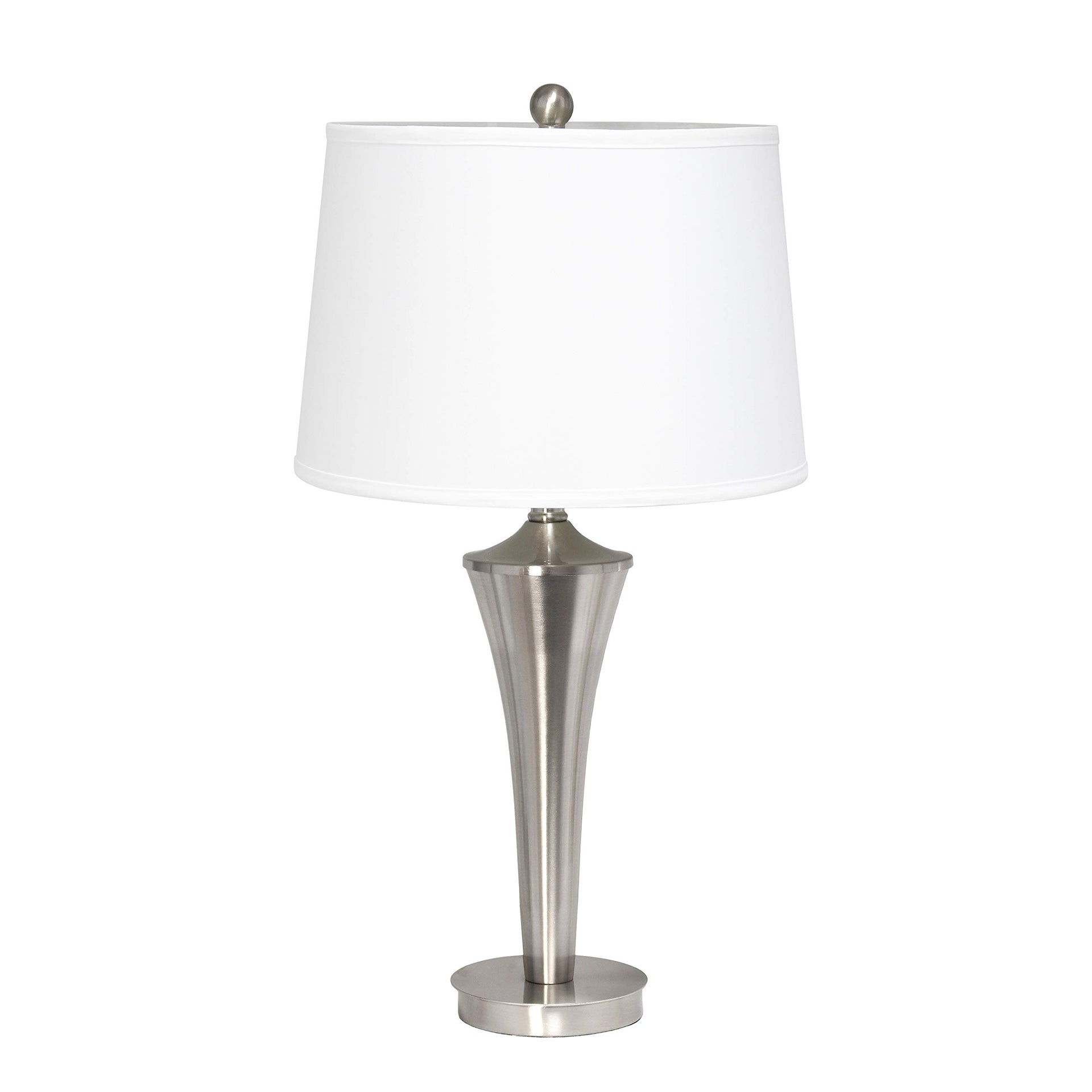 - Brushed Nickel tapered lamp style atop a circular base