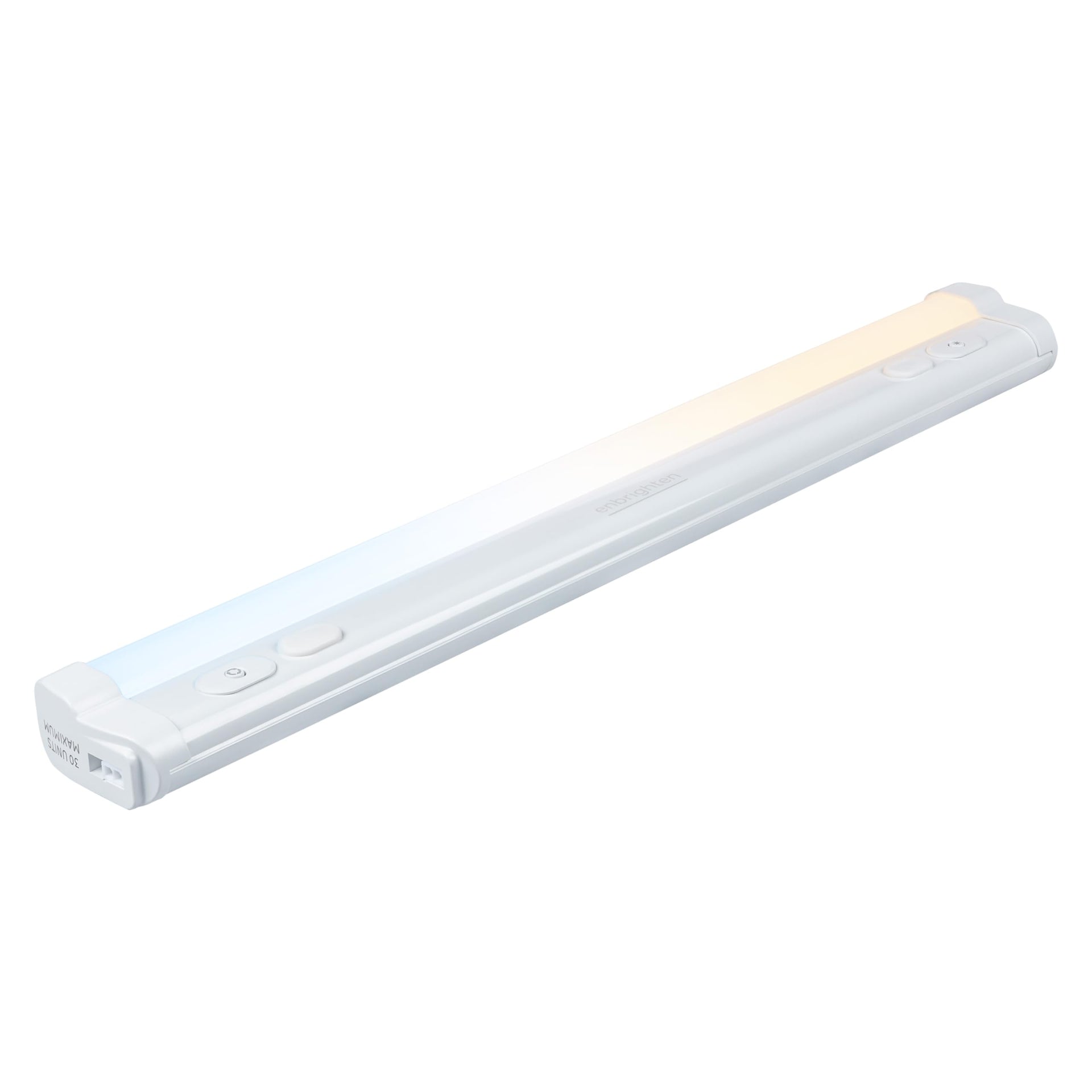 Details: Create a professional lighting setup with the dimmable Enbrighten Plug-In LED Light Bar. This sleek, lightweight 24in. fixture transforms your space with 1,561 lumens of fully diffused, high-quality illumination. This plug-in light fixture is powered by a standard wall outlet and features simple ON/OFF operation, adjustable brightness level with press-and-hold dimming and five color-temperature options ranging from soft white to cool daylight. These premium lighting options provide a customized setup that enhances your space while providing a practical lighting solution. Installation is easy and all mounting hardware is included. Easily link additional Enbrighten LED light bars with their included 18in. linking cords. The one-touch feature lets you control all linked fixtures simultaneously. Whether you want to adjust the color temperature and brightness level or turn the lights on or off, one button press updates the settings for all connected LED light bar fixtures. An add-on RF remote and direct-wire converter are sold separately and can expand the functionality of your lighting décor. Brighten your kitchen, office space, workbench and more with the Enbrighten Plug-In LED Light Bar — lighting for life!