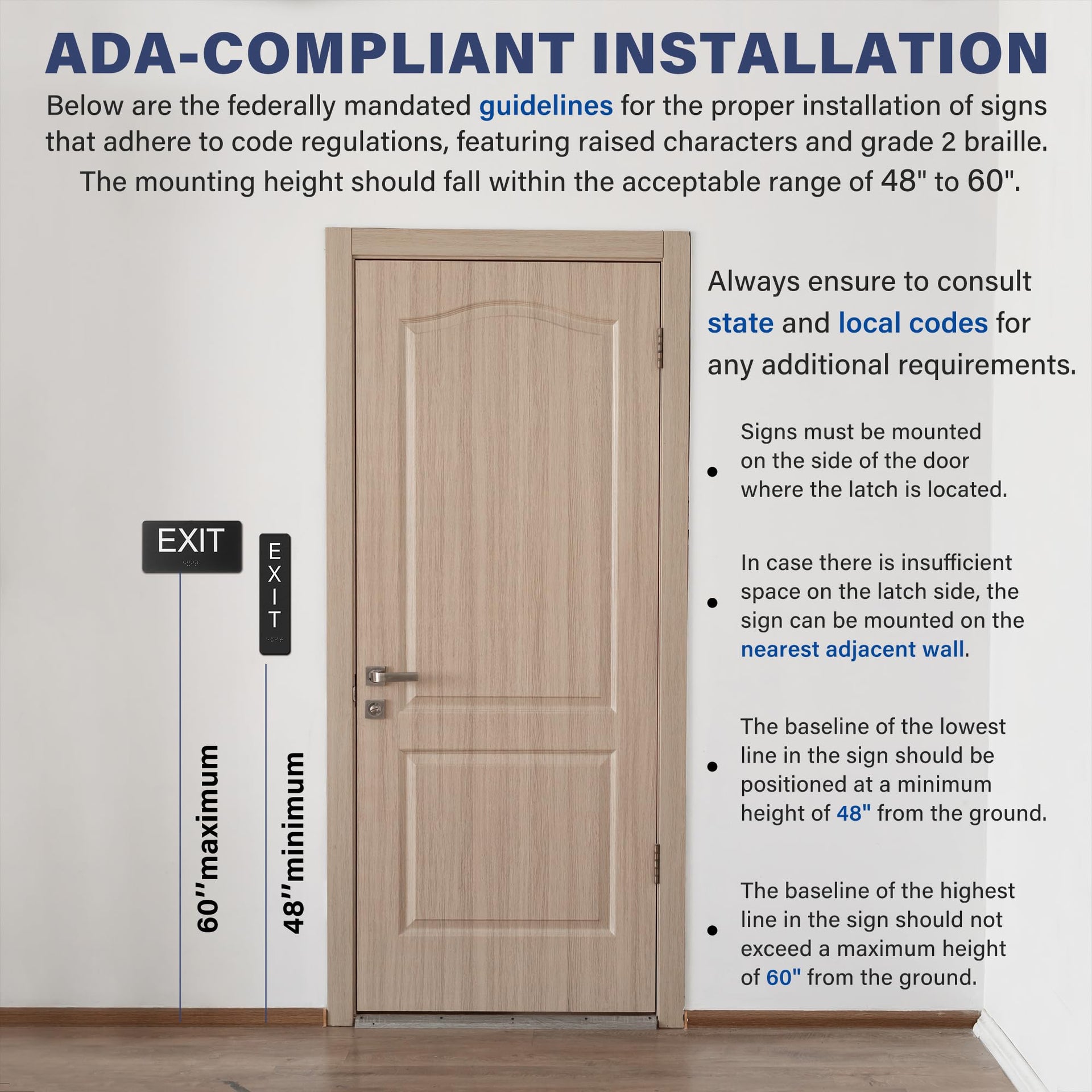- ● Easy Installation: According to the ADA standard to install the EXIT signs, placing it in the door of the 48-60 inches off the floor or wall. Quick installation by removing the double-sided adhesive tape