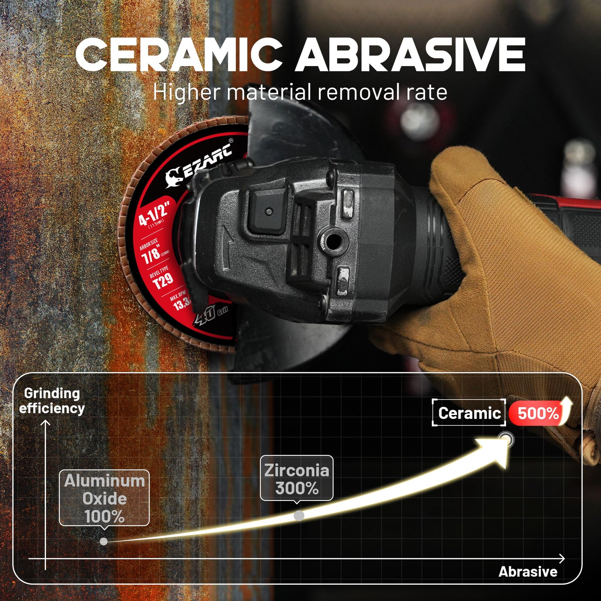 - 【Ceramic Abrasive】These flap discs are made with industrial-grade ceramic abrasives, offering double the grinding power and superior heat dissipation. Ceramic discs also last 3X longer than zirconia discs and 5X longer than aluminum oxide discs.