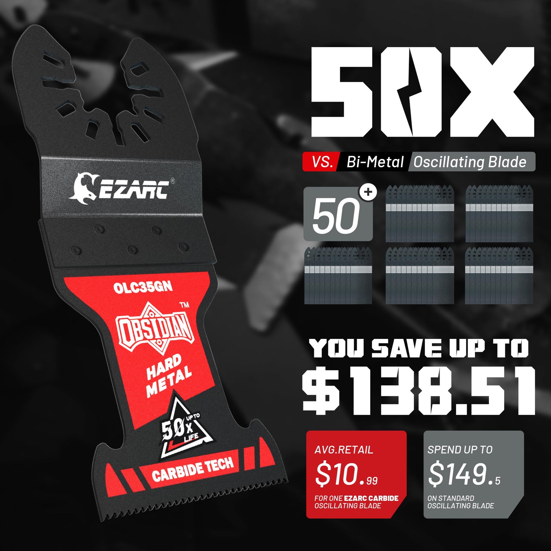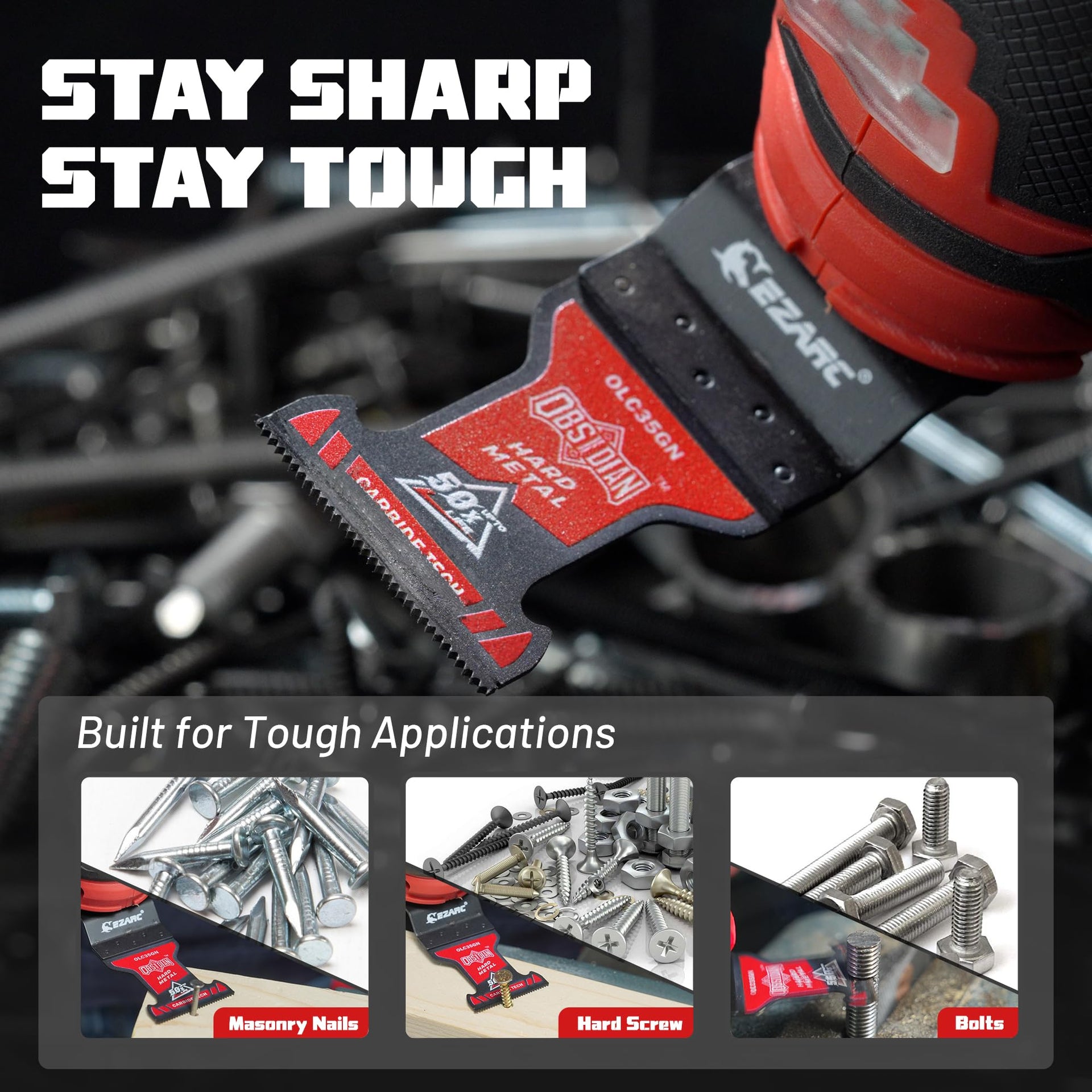 - 【50X Longer Life】EZARC carbide oscillating saw blade is designed for heavy metal cutting applications like masonry nails, thick metal, screws, wood & nails, bolts, rebar, copper pipe. Lasts up to 50x longer than standard bi-metal multi tool blades.