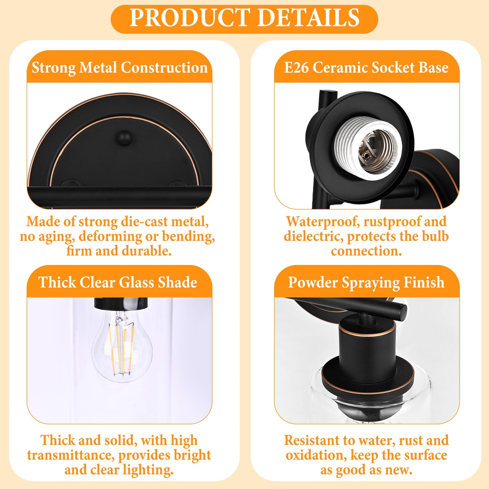 - 【Thickened&Reinforced Glass Shade】 Instead of flimsy and cheap plastic shades, this oil rubbed bronze bathroom wall lights 3 light use thicker clear glass shade for brighter lighting and longer service life. The glass bathroom vanity oil rubbed bronze light will give off plenty of light to create a beautiful and bright atmosphere in your house. Recommend used with LED bulbs which would help the 3-light bathroom light fixture over mirror provides soft light while eliminating harsh glare.