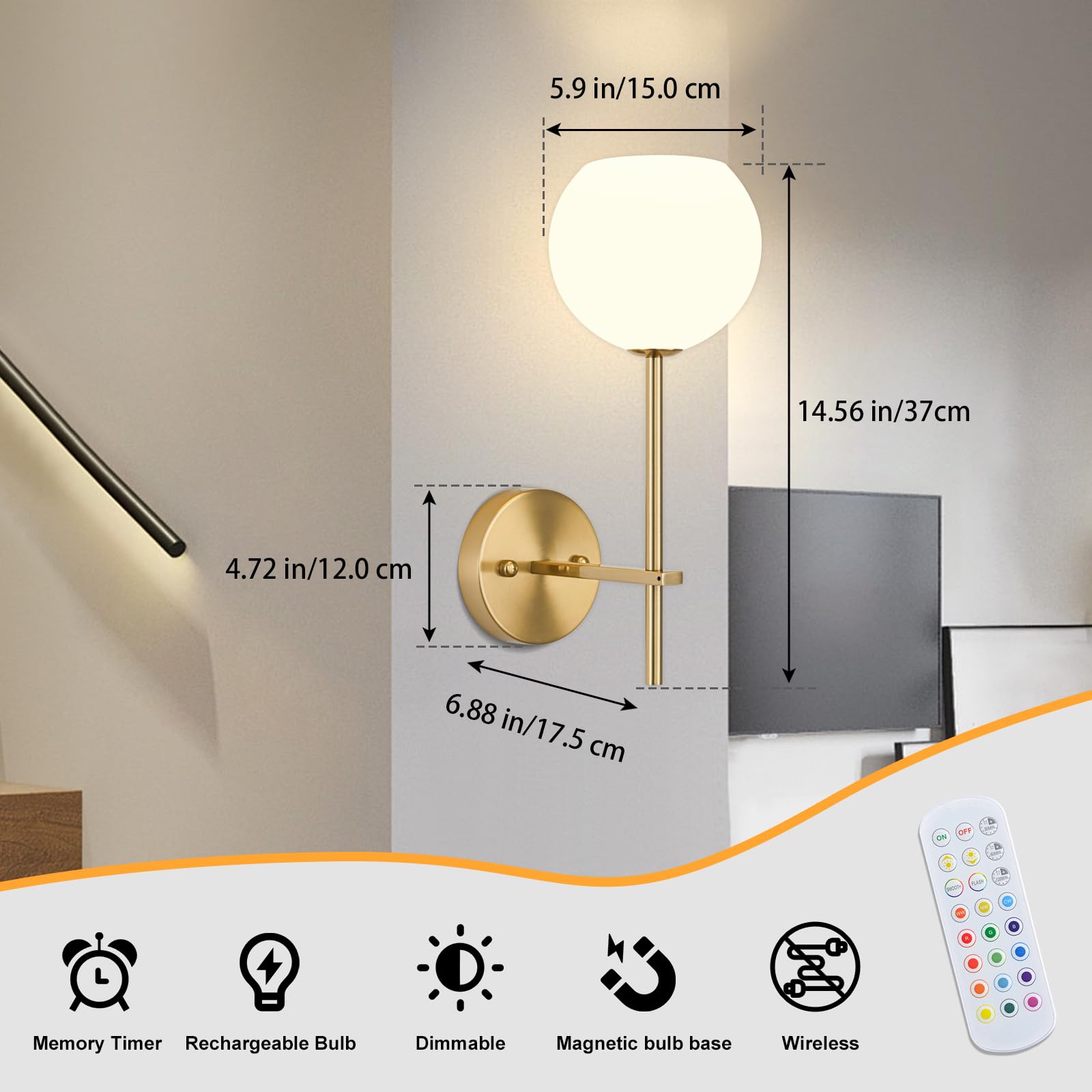 - Rechargeable Bulb: 3200-cycle charging test, Wireless wall sconces feature 12 RGB colors with smooth cycling and flashing effects to create any ambiance - from warm glow to vibrant party lighting. Sleek, mood-enhancing illumination for any space.