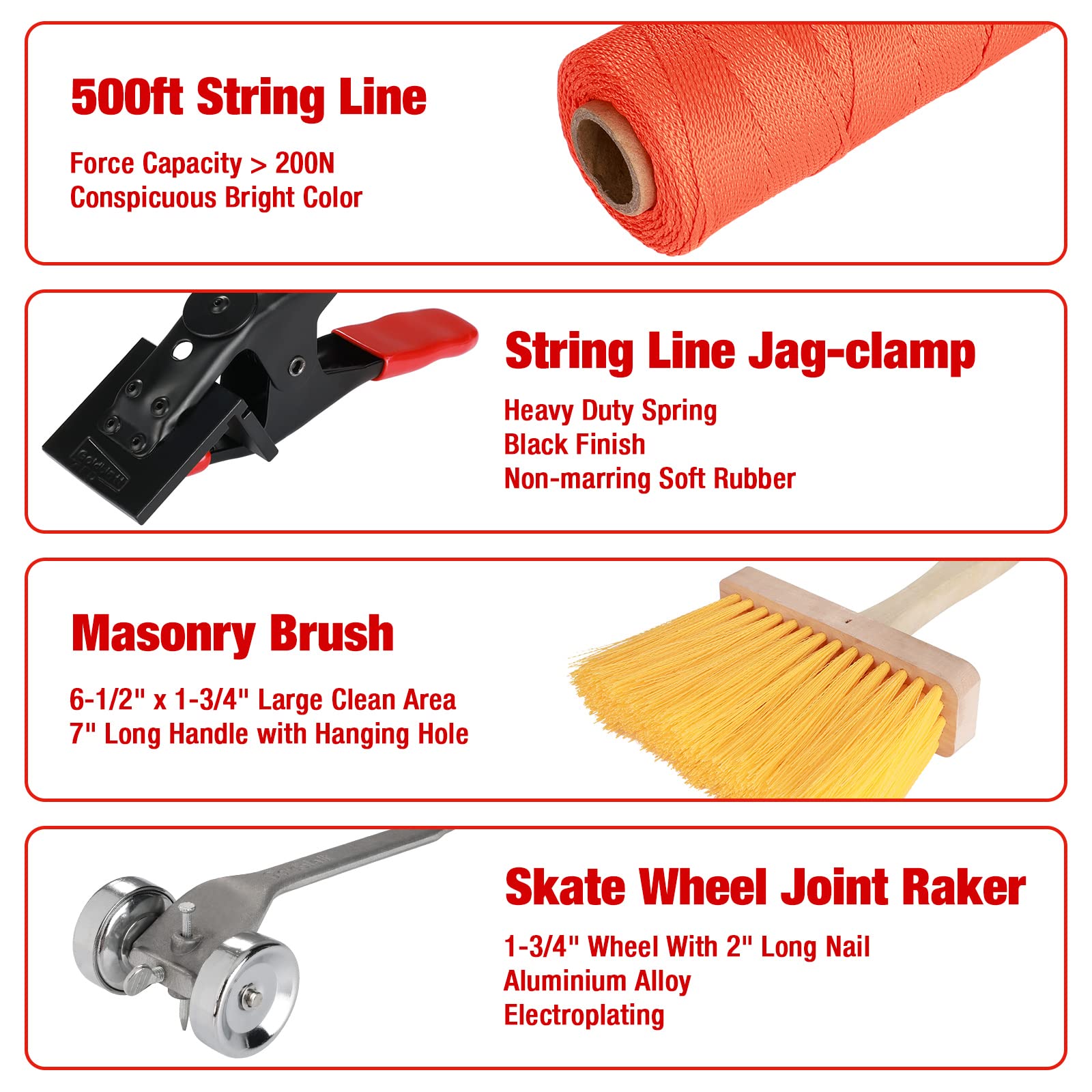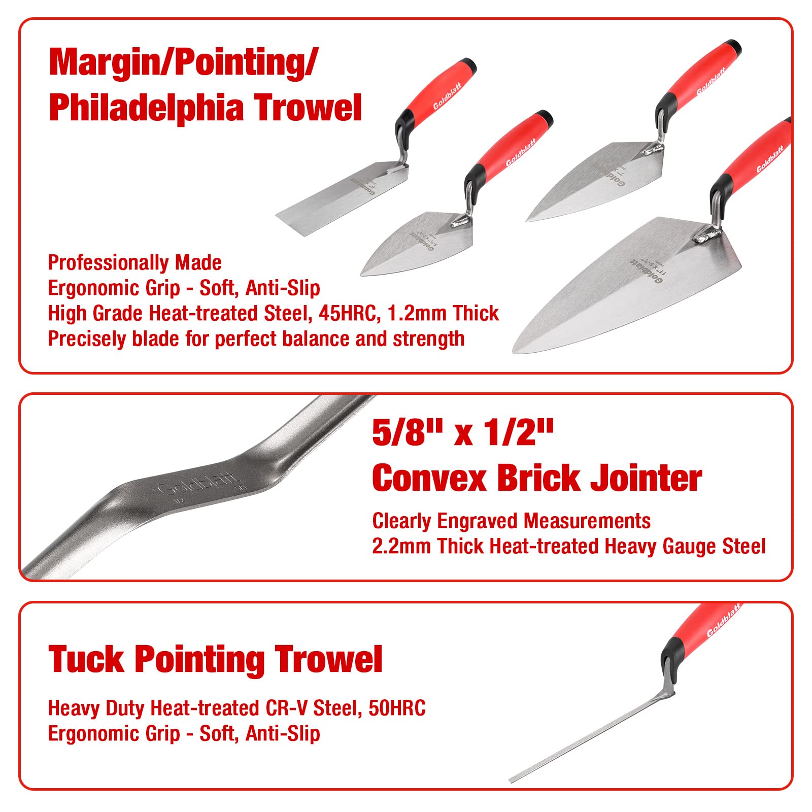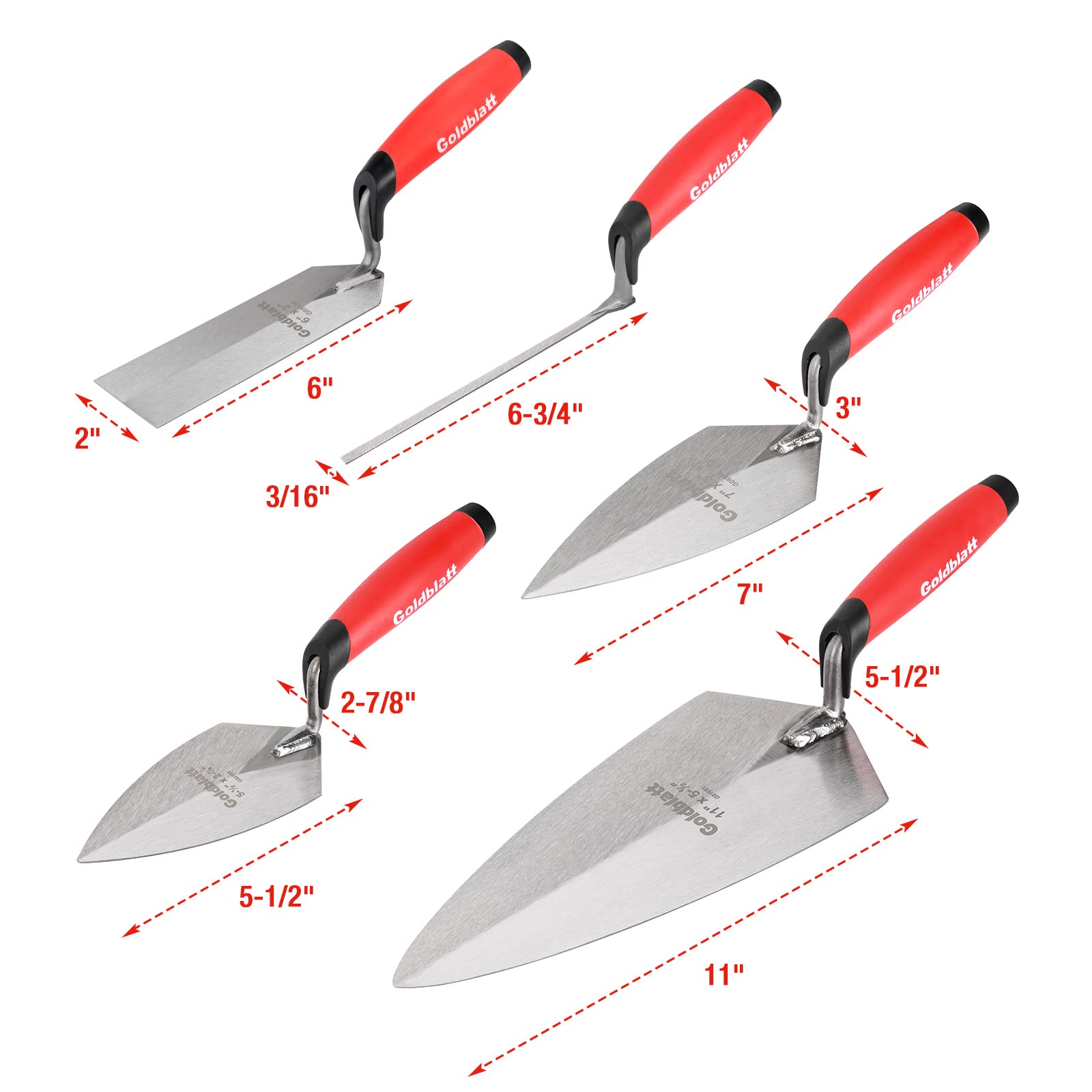 Goldblatt 12PC Masonry Hand Tool Set with Tool Bag – Trowels, Brick Jointer, Raker, String Line, Jag-Clamp & Masonry Brush