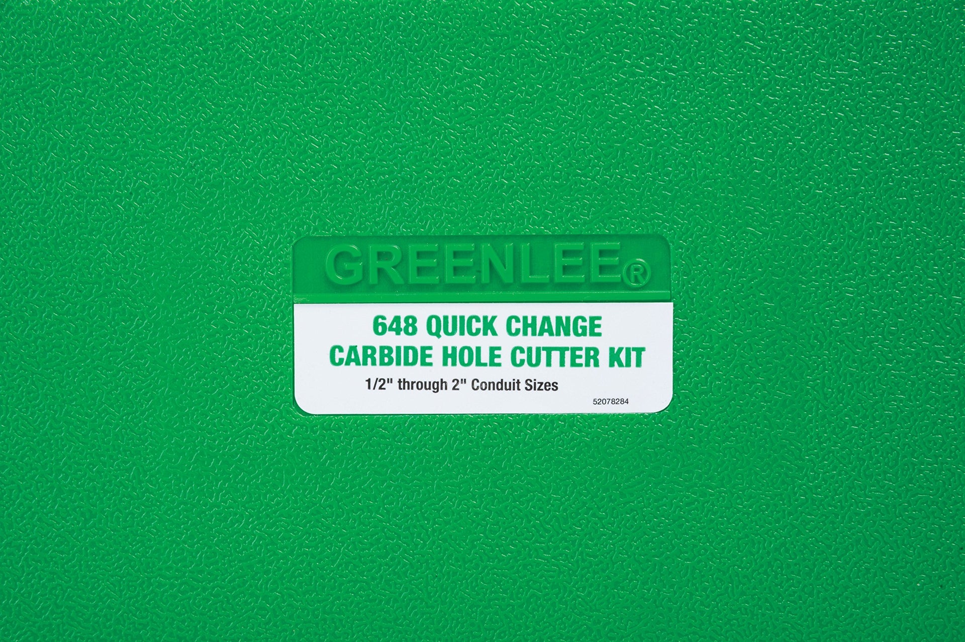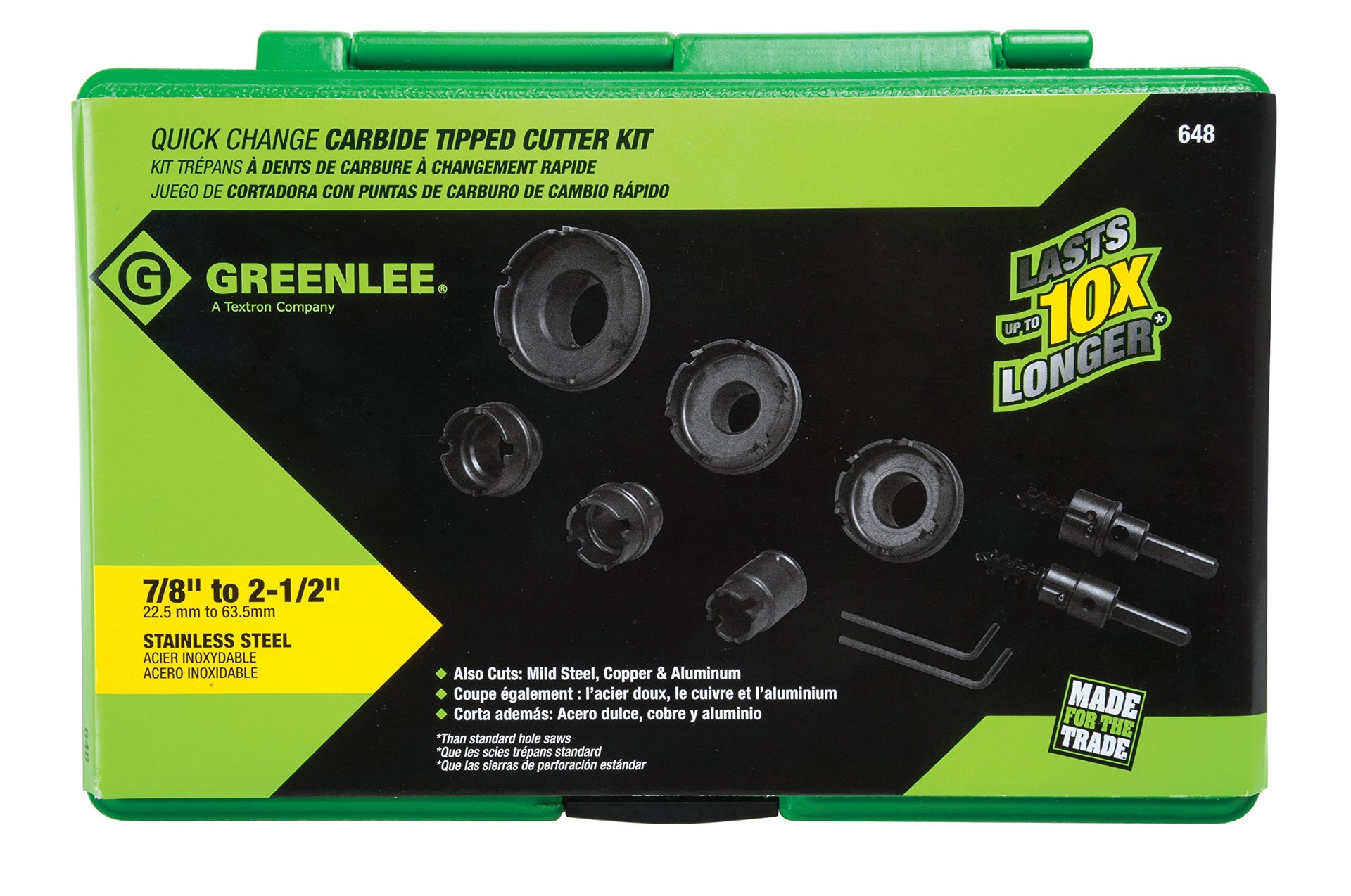 Details: Complete Solutions for 1/2-Inch to 2-Inch conduit. Fast, accurate holes in stainless steel, mild steel, iron, copper, brass, aluminum, fiberglass and plastic sheet. Extends tool life with reduced friction, torque and heat. Quick Change Arbor – change cutter heads with a simple push and turn. Split point, cobalt-steel pilot drill eliminates walking and penetrates quickly. Precision engineered, tungsten carbide teeth for fast cutting of round, burr-free holes. Optimized carbide placement reduces friction and torque – requires less force and generates less heat while cutting. Flange Stop for Safety – prevents over-drilling. Application: Cut fast, accurate holes in stainless steel, mild steel, iron, copper, brass, aluminum, fiberglass and plastic sheet up to 3/16-Inch (4.8mm) thick. Cutting Edge: Tungsten Carbide Teeth. Hole Size: 6 sizes: 7/8-Inch, 1-1/8-Inch, 1-3/8-Inch, 1-3/4-Inch, 2-Inch, 2-1/2-Inch. Maximum Cutting De: 3/16-Inch (4.8MM). Pilot Drill: Cobalt High Speed Steel 645-001: Use with 645-011 Arbor, 645-002: Use with 645-022 Arbor. Pilot Drill Size: 645-001: 1/4-Inch X 2.56-Inch Long, 645-002: 5/16-Inch X 2.72-Inch Long. Shank Size: 645-011: 3/8-Inch (9.5mm), 645-022: 7/16-Inch (11.1MM). Kit contents: 645-7/8, 645-1-1/8, 645-1-3/8, 645-1-3/4, 645-2, 645-2-1/2, 645-011, 645-022, 2 hex keys. Ejector Spring – automatic slug removal with every cut.
