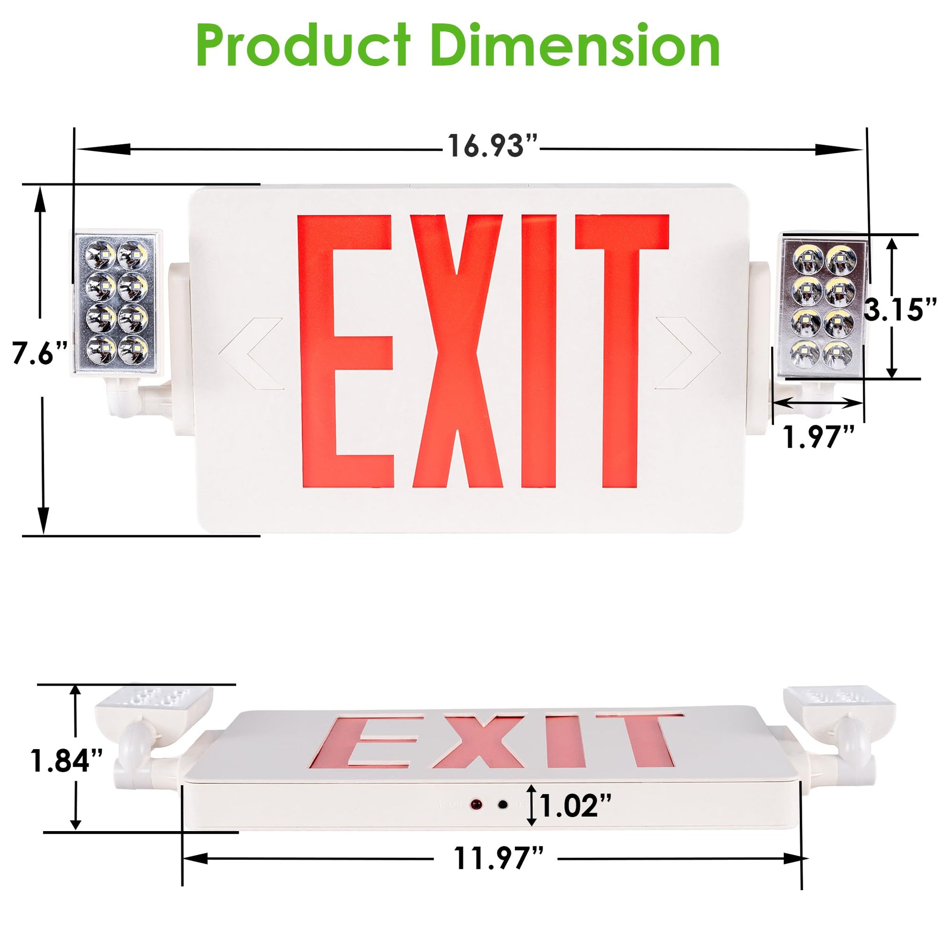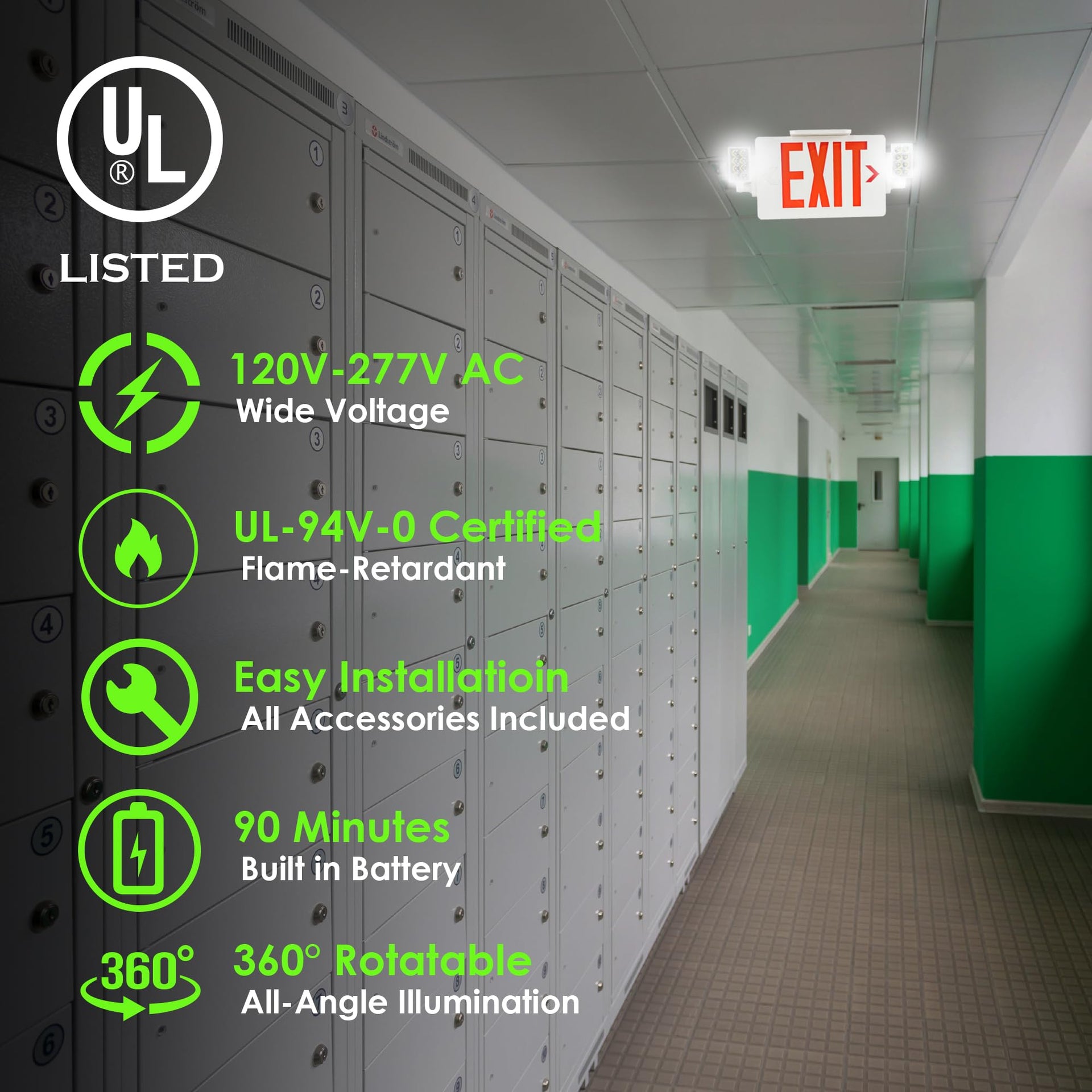 - Universal Voltage & Backup Power: Supports 120-277V AC universal voltage, suitable for both residential and commercial spaces. This emergency exit sign with lights battery backup provides at least 90 minutes of emergency lighting during power outages, ensuring visibility and safety.