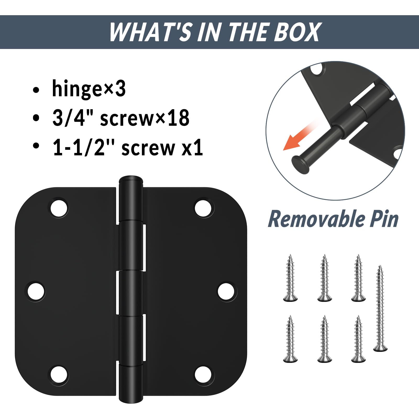 HOSOM Door Hinges 3 Pack Rounded Matte Black Door Hinge 3.5 x 3.5 inch with 5/8 Radius, Black 3 1/2 Interior Door Hinges, 3 ½"x 3 ½" Hardware