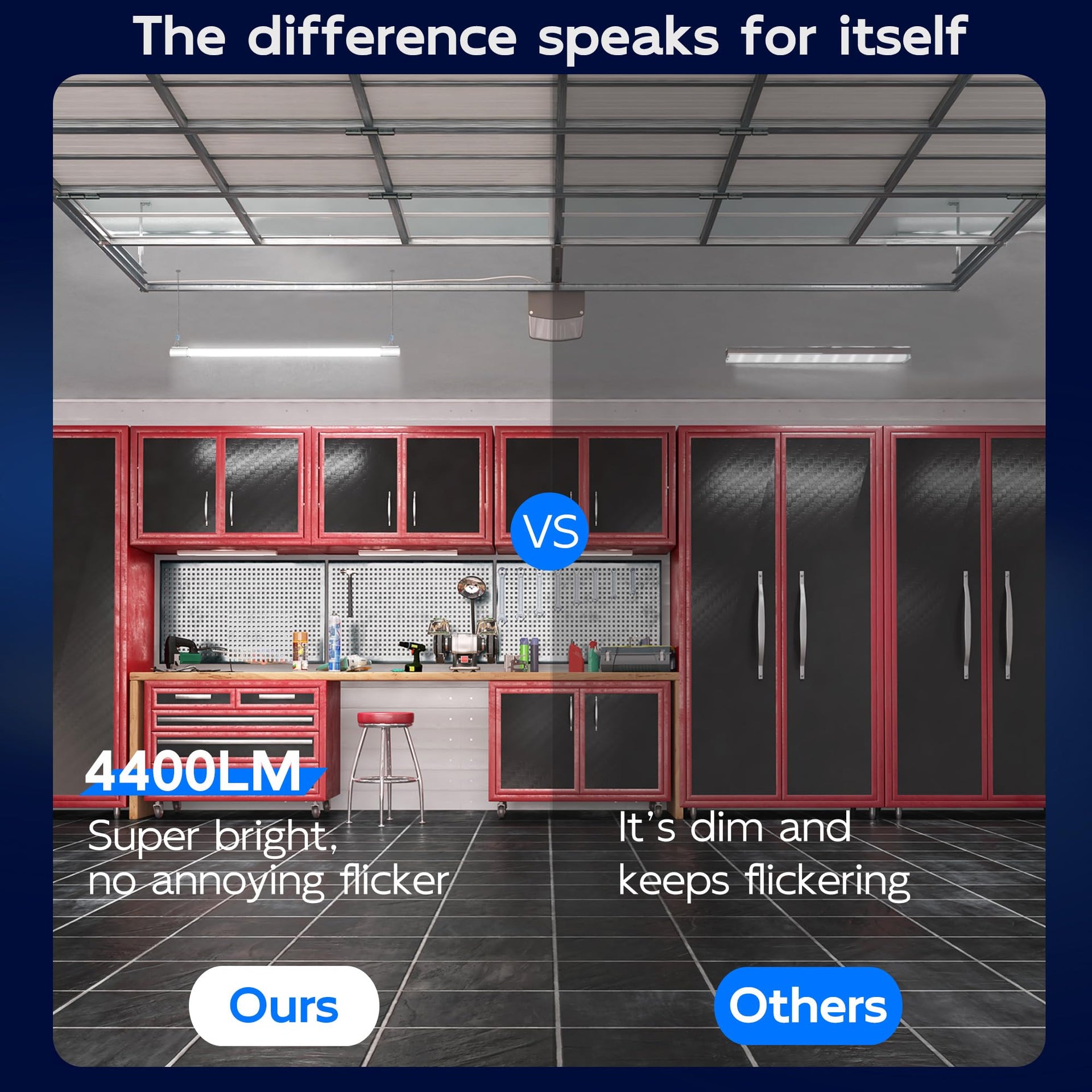 - ✅ Super Bright - 4FT led shop lights feature 4400 lumens brightness at 5000K Daylight White by using only 42W. That is a staggering LED Efficiency of 105 lm/w! Excellent replacement of conventional fluorescent fixture. Energy Savings of up to 75%