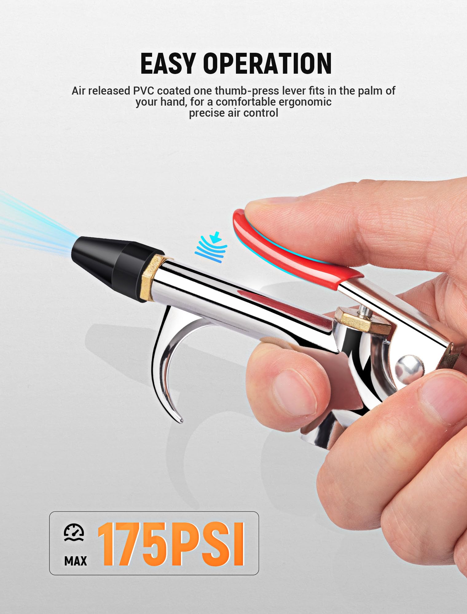 - 【Powerful Airflow for Deep Cleaning】 JASTIND air compressor accessories blow gun is engineered with an innovative internal pressurization structure and a tapered air nozzle that delivers a high-volume, powerful airflow. This design makes the tapered air nozzle for air compressor ideal for cleaning hard-to-reach areas. Plus, the rubber-tipped nozzle prevents scratching of items and delicate surfaces.
