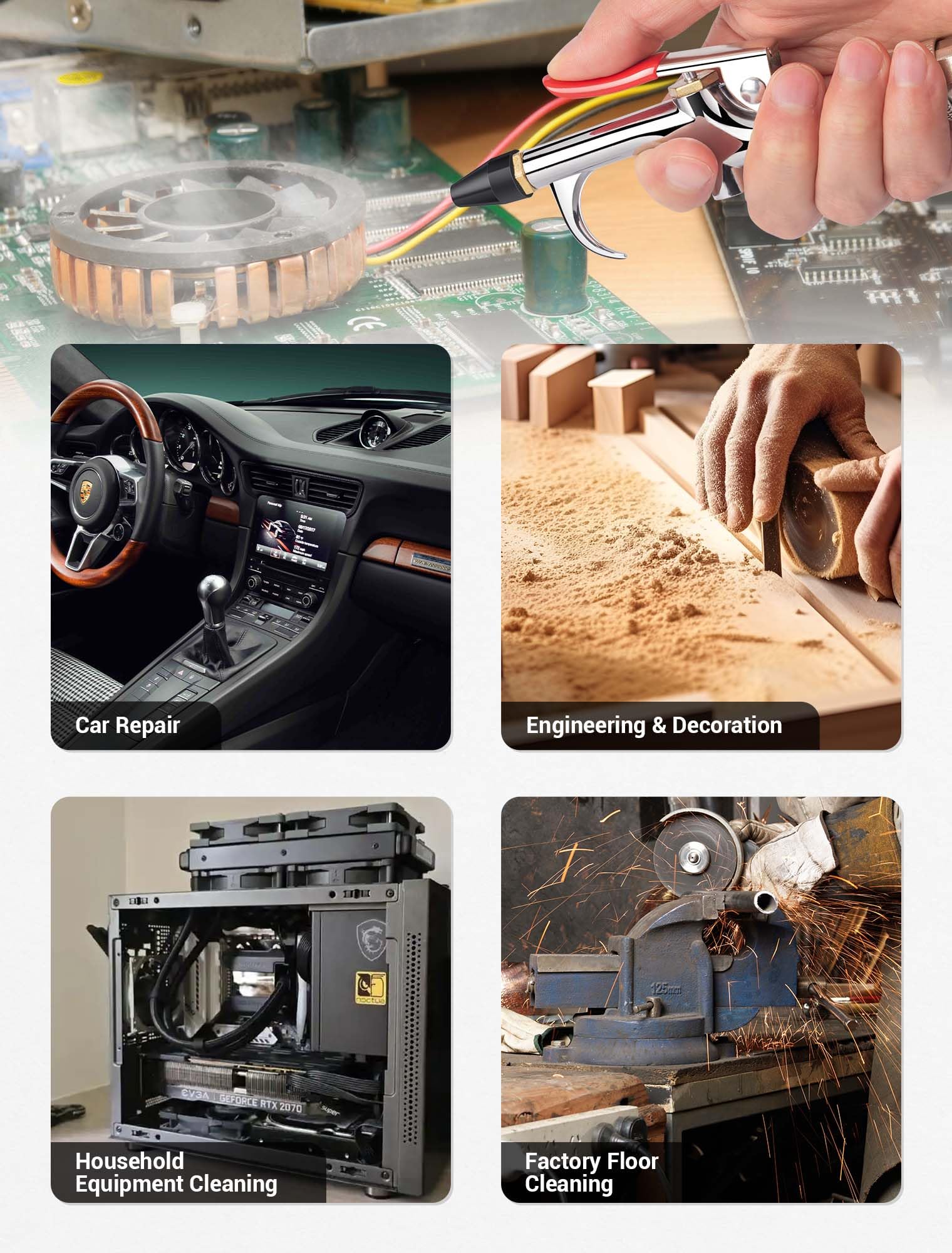- 【Wide Application】 This 4pcs air nozzle kit is versatile and ideal for blowing dust, water, powder, wood shavings, metal shavings, and more. It's perfect for a range of tasks, including home maintenance, automotive work, factory workshops clean, and computer repair cleanups. Just buy with confidence, any product problems please feel free to contact us at any time.