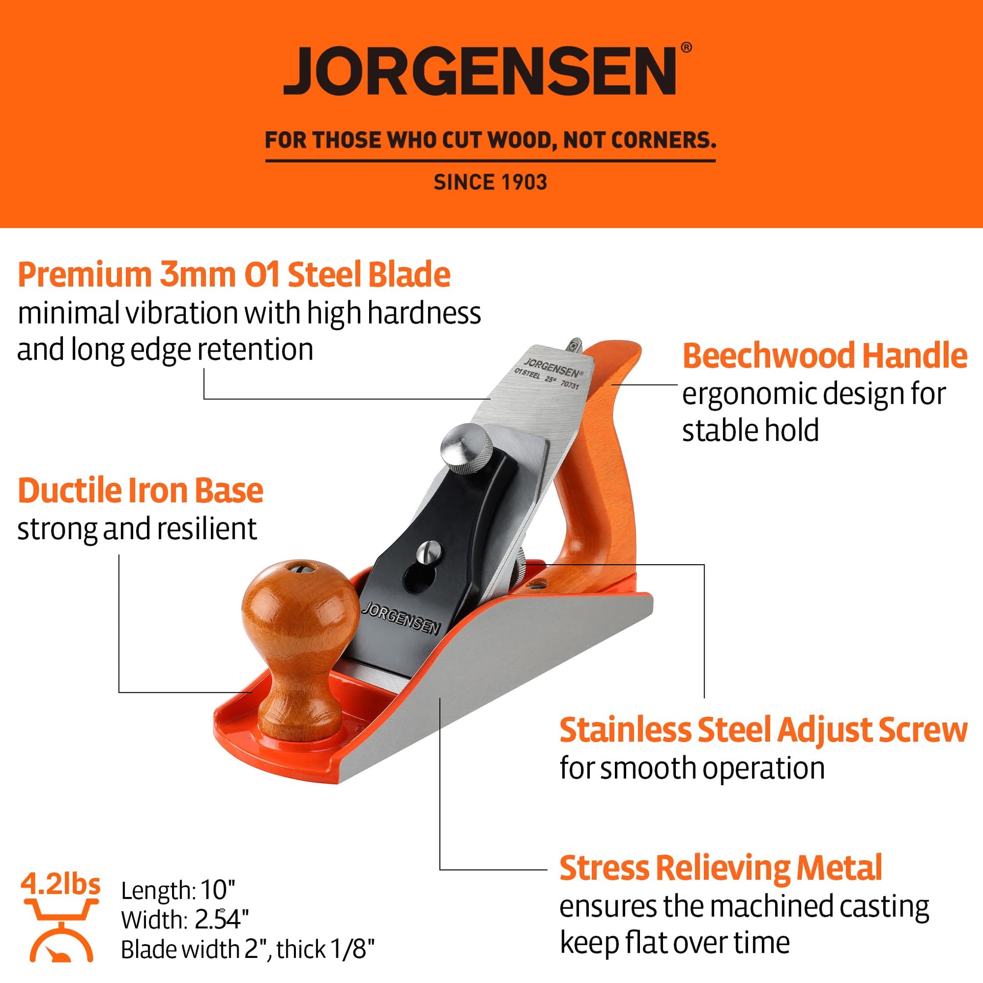 JORGENSEN No.4 10" Wood Hand Planer – Professional Smoothing Plane, Adjustable Depth, Ductile Iron Body for Woodworking & Craft