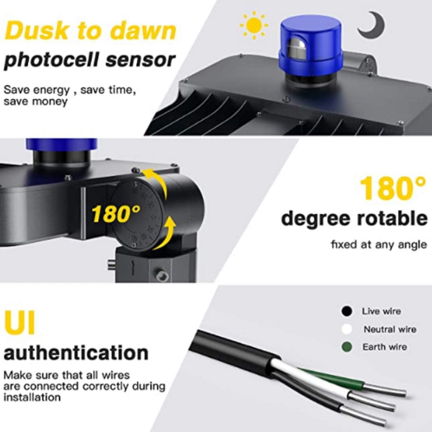 - Convenient and labor-saving:The bracket of the led outdoor light can be adjusted 180¡ã, which makes the lighting more convenient. The unit also has photocells for dusk to dawn use
