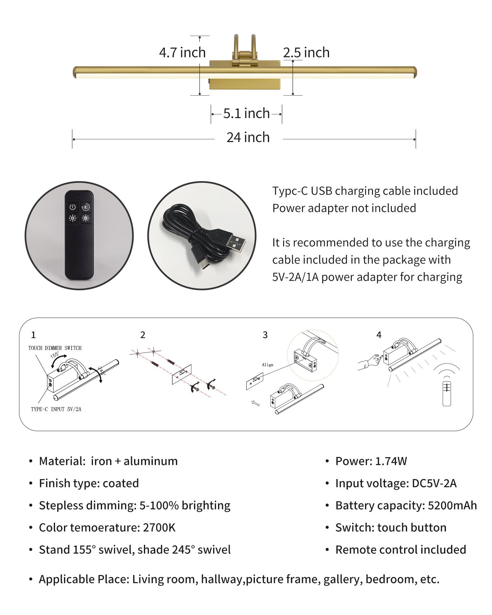 - Easy to install:Screw the base plate to the wall and secure the wall sconce to the base plate. The base plate can be easily removed for charging. Flexible rotating swing arm allows you to place the light at the optimal lighting angle, ensuring that your artwork or picture is illuminated from the ideal direction.