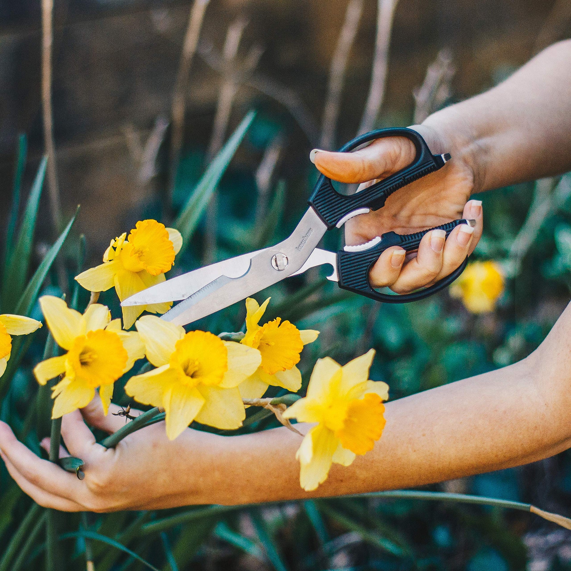 Details: The Taskmaster Shears are the ideal coverall tool in the kitchen, office, yard or garage. Whether preparing food, opening packages, trimming flowers or cutting cord, these more-than-scissors are the highly functional, multi-purpose tools of choice. The handles feature a built-in nutcracker, jar opener, lid lifter, and even two screwdriver tips for tightening a loose screw. The Taskmaster Shears utilize one serrated blade to cut through tough, fibrous materials with ease and feature a bone notch that comes in handy when trimming flower stems. A non-slip plastic over-mold on the handles makes them comfortable to use in any conditions. The blades separate for simple cleaning and sharpening, securely locking together again for your next job.