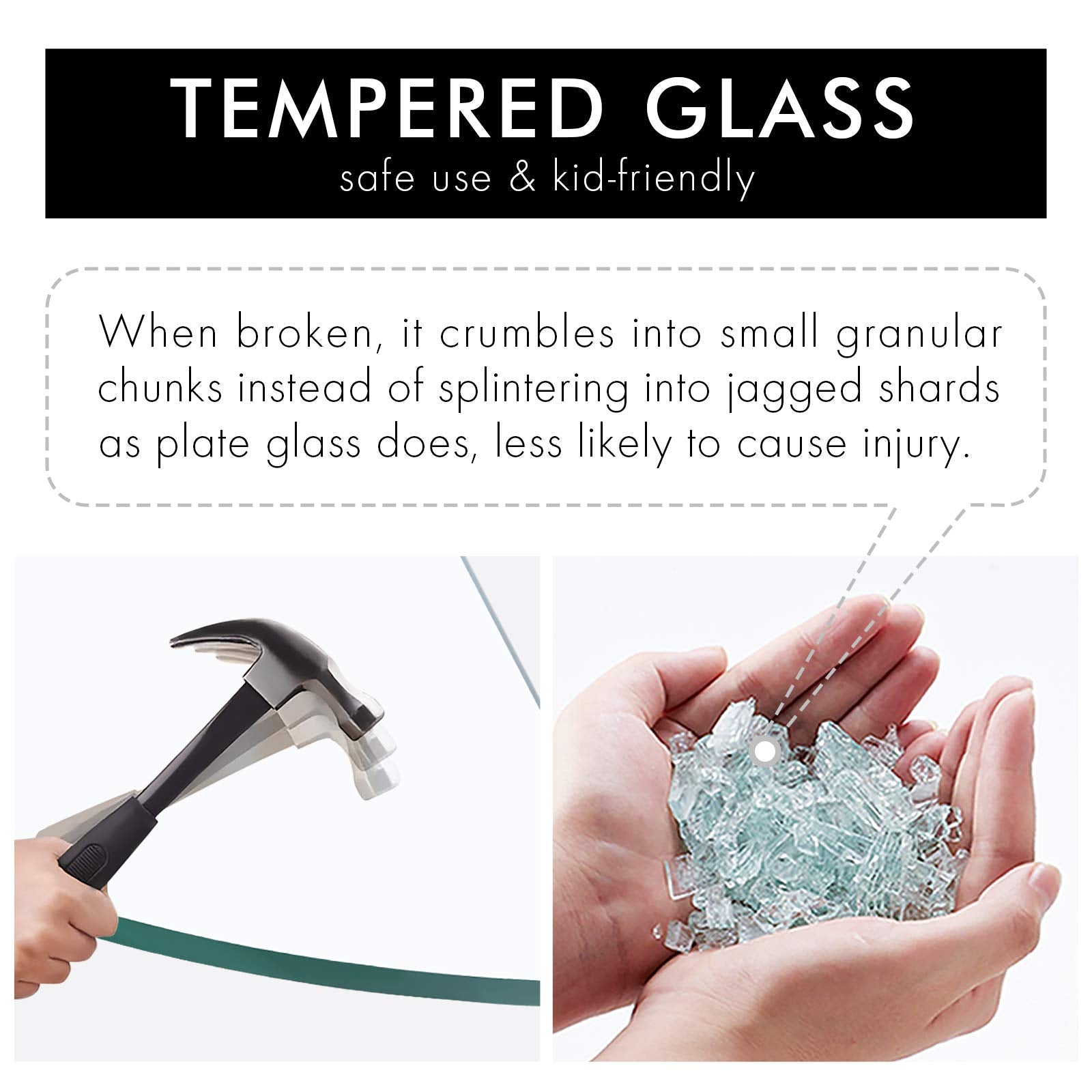 - Extra-Thick (8mm) Tempered Glass (Clear) - Safe use. When broken, it crumbles into small granular chunks instead of splintering into jagged shards as plate glass does, less likely to cause injury.