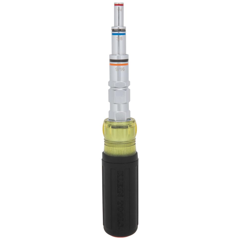 Details: Klein's 9-in-1 Pass Through Multi-Nut Driver features fully pass through drivers for driving nuts on threaded rod and prevents bottoming out. Nine SAE sizes in one tool with color coded ends make it convenient to identify the size needed for the job. All sizes allow for easy, one-handed driving. Increase your productivity and lighten your load with this multi-nut driver. For more than 160 years, Klein Tools has manufactured premium-quality, professional-grade hand tools that deliver the performance, durability and precision needed to get the job done right. Our family of engineers, workers and craftsman continue to put six generations of expertise into every tool we create by using only the highest quality materials, superior workmanship, and keeping manufacturing as close to home as we can. Klein isn't just the name of our company, it's also our family name. And since we're an American company that's family-owned and family-run, you know you can count on us to be here tomorrow. Klein Tools doesn't just make great products, we make great products that stand up to the demands of the professionals who use them every day ... Since 1857.